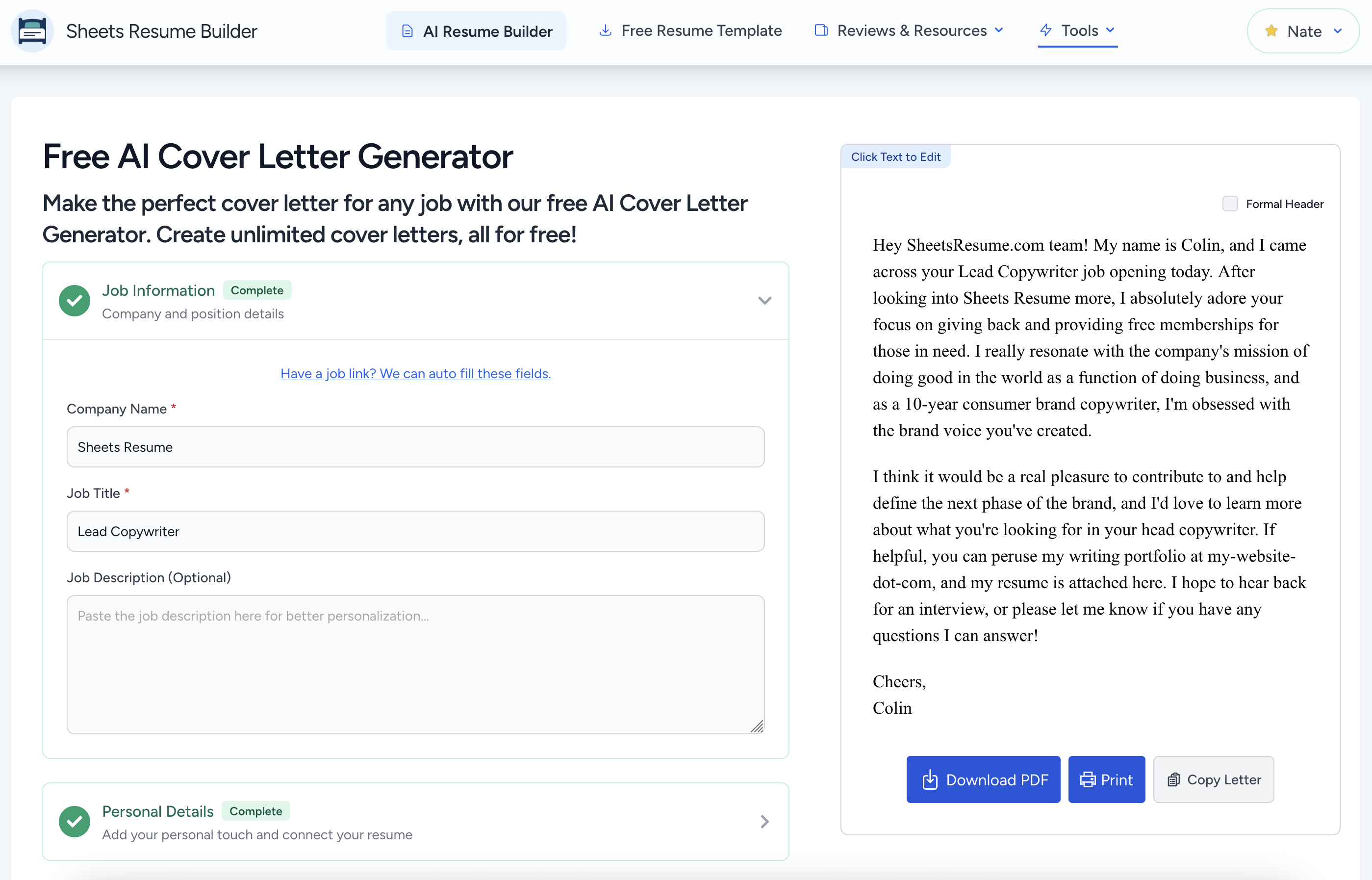 My favorite tool was the cover letter builder. It was easy to use, and I loved that you could make it longer or shorter, more formal or less formal. This tool saved me countless hours during my job hunt. Review collected by and hosted on G2.com.