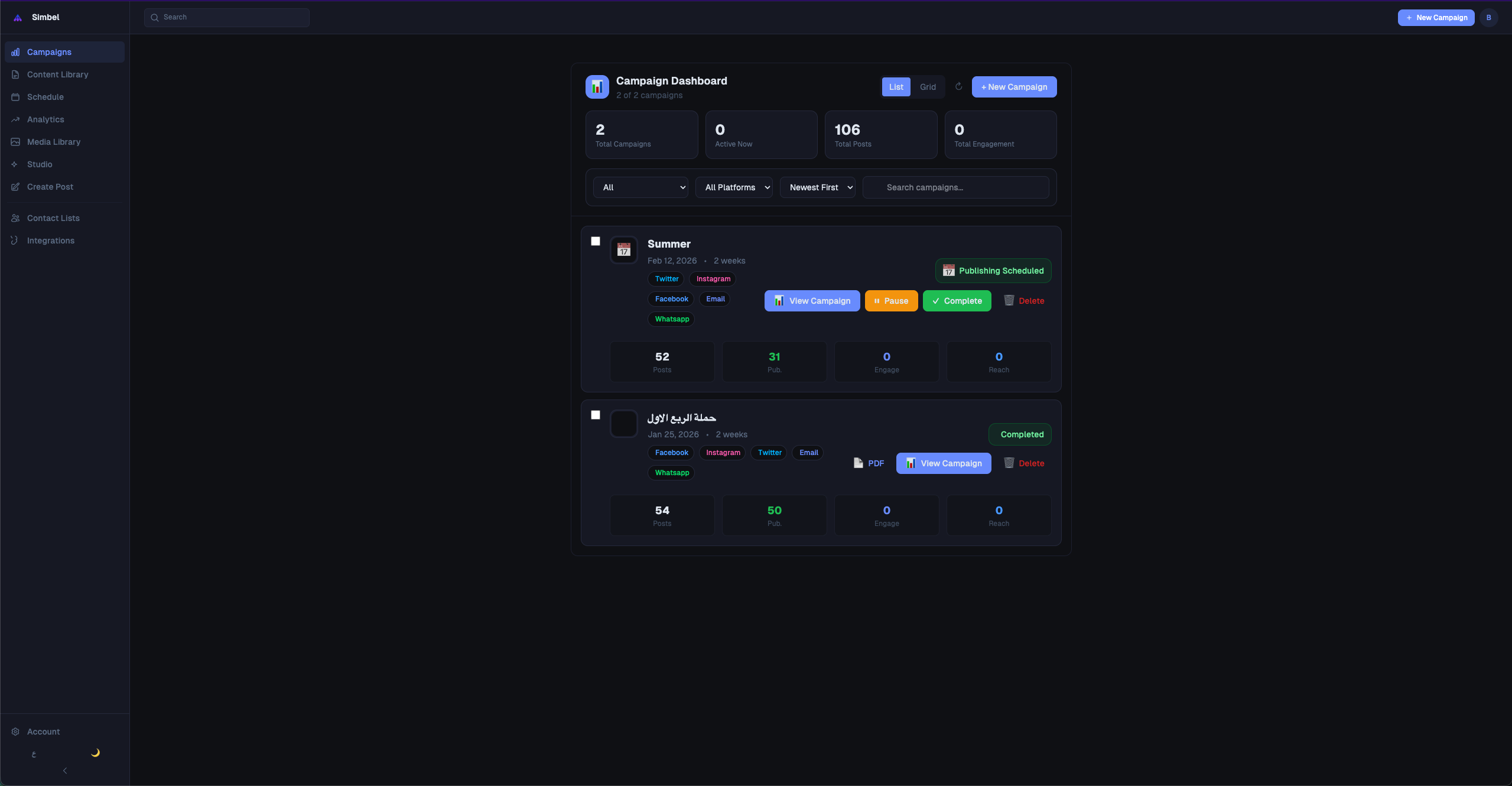 AI-powered automation, 7 platforms, scheduled auto-posting, a specialized AI Agents teams to handle your social media accounts starting form research and planning (Industry Analysis, Competitor Analysis, Audience Analysis, Platforms Trends Analysis), Comprehensive Campaign Plan that contains (SOSTAC, PESTLE, SWOT, market size, competitive positioning, demographics, psychographics, interests, pain points, goals, values, plan for each platform, brand voice and more), daily content creation with AI agents specialized and trained for each platform best content, and posting for all platforms with scheduling AI agents groups for each platform, best time of posting, learns over time, real-time analytics for all platforms metrics and KPIS to inform knowledge base by AI agents analytics groups for collecting and analyzing data from all your social media accounts platforms, connect your social media accounts and Simbel will handle all of them, add your email lists and whatsapp contact and Simbel will include them in the campaign plan, create content for them and will be included in your posting schedules to send emails and messages to your clients, determine your objectives like lead generation, brand awareness engagement, website traffic, customer retention, product launch, seasonal promotion, and Simbel will handle it all, Saudi Arabia, Egypt, MENA-focused Review collected by and hosted on G2.com.
