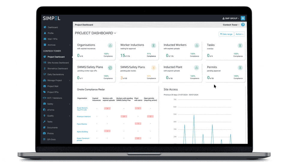 - Centralise documentation – SWMS, inductions, permits, and compliance records are stored in one secure place, reducing paperwork and confusion.