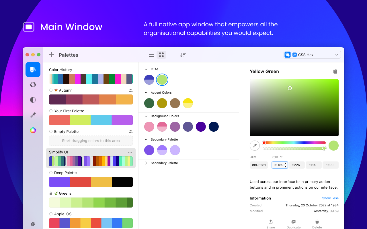 You can build extensive palettes of a few or even hundreds of colors. You can quickly and easily convert them between Hex codes, RGB, and more for quick copy-and-pasting, and you can even learn "names" for the colors to help reference them easier! Review collected by and hosted on G2.com.
