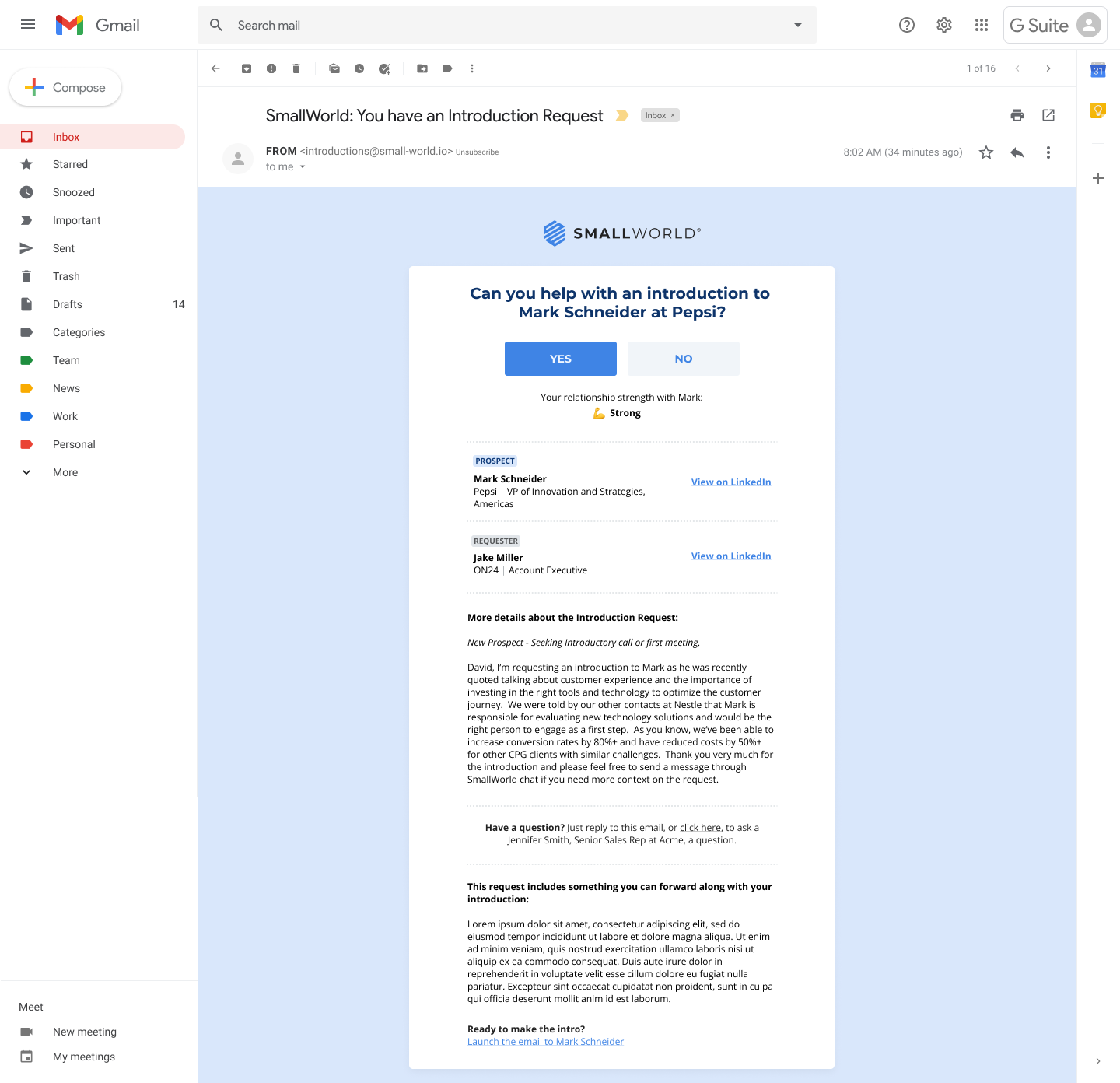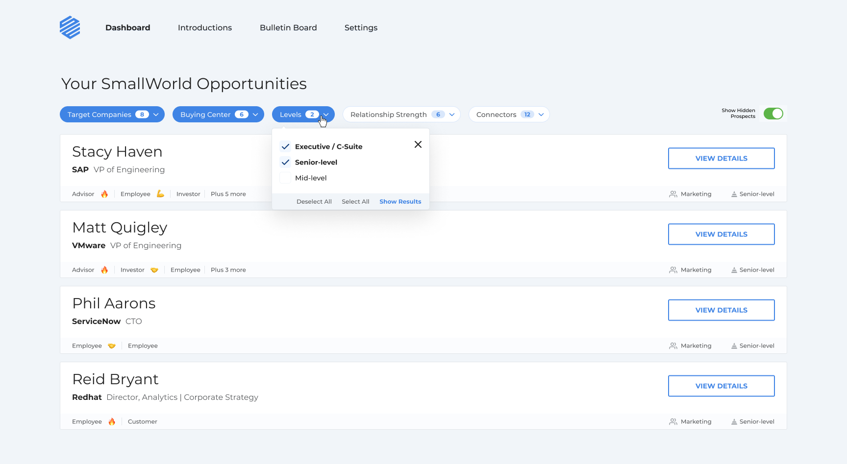I'm most impressed with its ability to have verified strength. Typically when I connect with someone new, they have over 4000 contacts. I have no way of knowing which ones are strong and which ones are weak. SmallWorld was built to find the needle in the haystack and so I'm only trying to generate referrals from thos in my network that can actually get it done! Review collected by and hosted on G2.com.