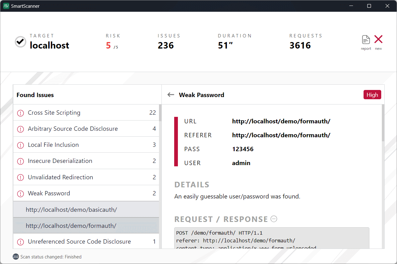 Acunetix by Invicti automatically crawls and scans off-the-shelf and custom-built websites and web applications for SQL Injection, XSS, XXE, SSRF, Host Header Attacks & over 3000 other web vulnerabilities. It also provides a wide variety of reports to help developers and business owners alike to quickly identify a web application’s threat surface, detect what needs to be fixed, and ensure conformance with several compliance standards.
