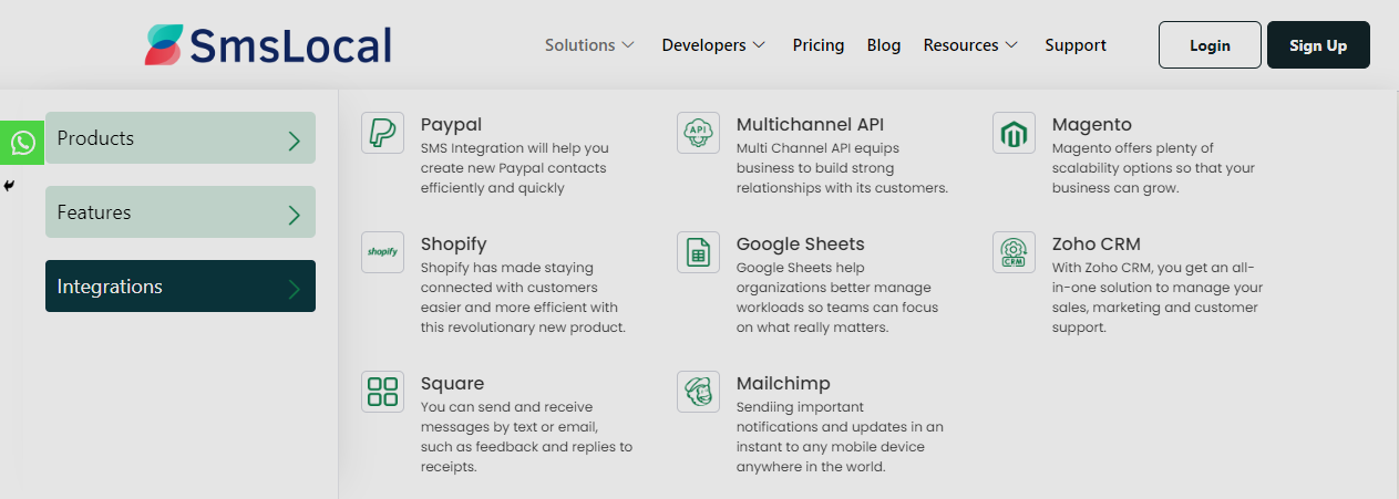 The SMS Local integration offers seamless connectivity with platforms like PayPal, Shopify, Google Sheets, and Zoho CRM to enhance communication and streamline workflows. It also supports integrations with Square, Mailchimp, and Magento for efficient customer engagement, notifications, and scalab...
