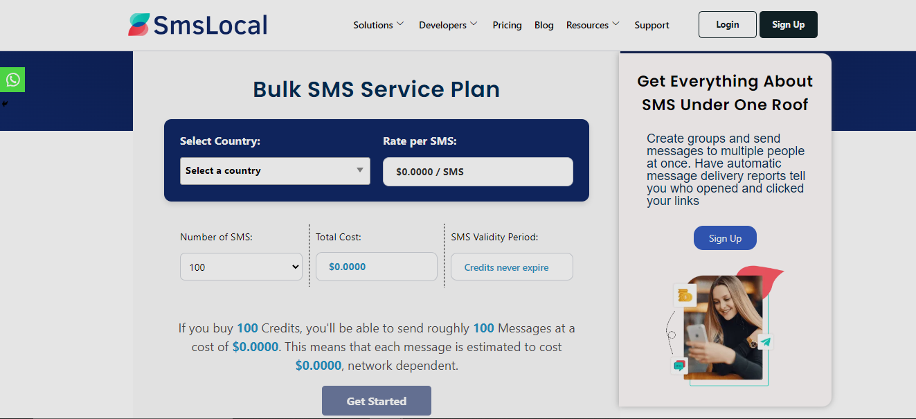 The SMS Local Bulk SMS Service Plan page allows users to select a country, calculate the rate per SMS, and determine the total cost for sending messages. It offers flexible options for bulk messaging, with credits that never expire, ensuring businesses can send messages efficiently. The page also...