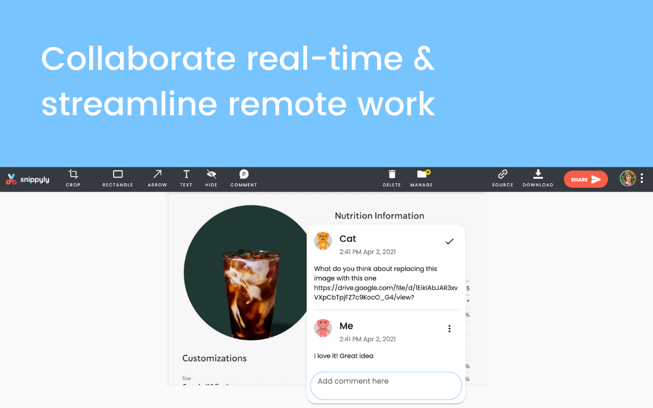 I like how it is so easy to collaborate with others with real-time annotations without noticeable lag with the ability to send Slack messages and have a call right whiting a Snippyly.