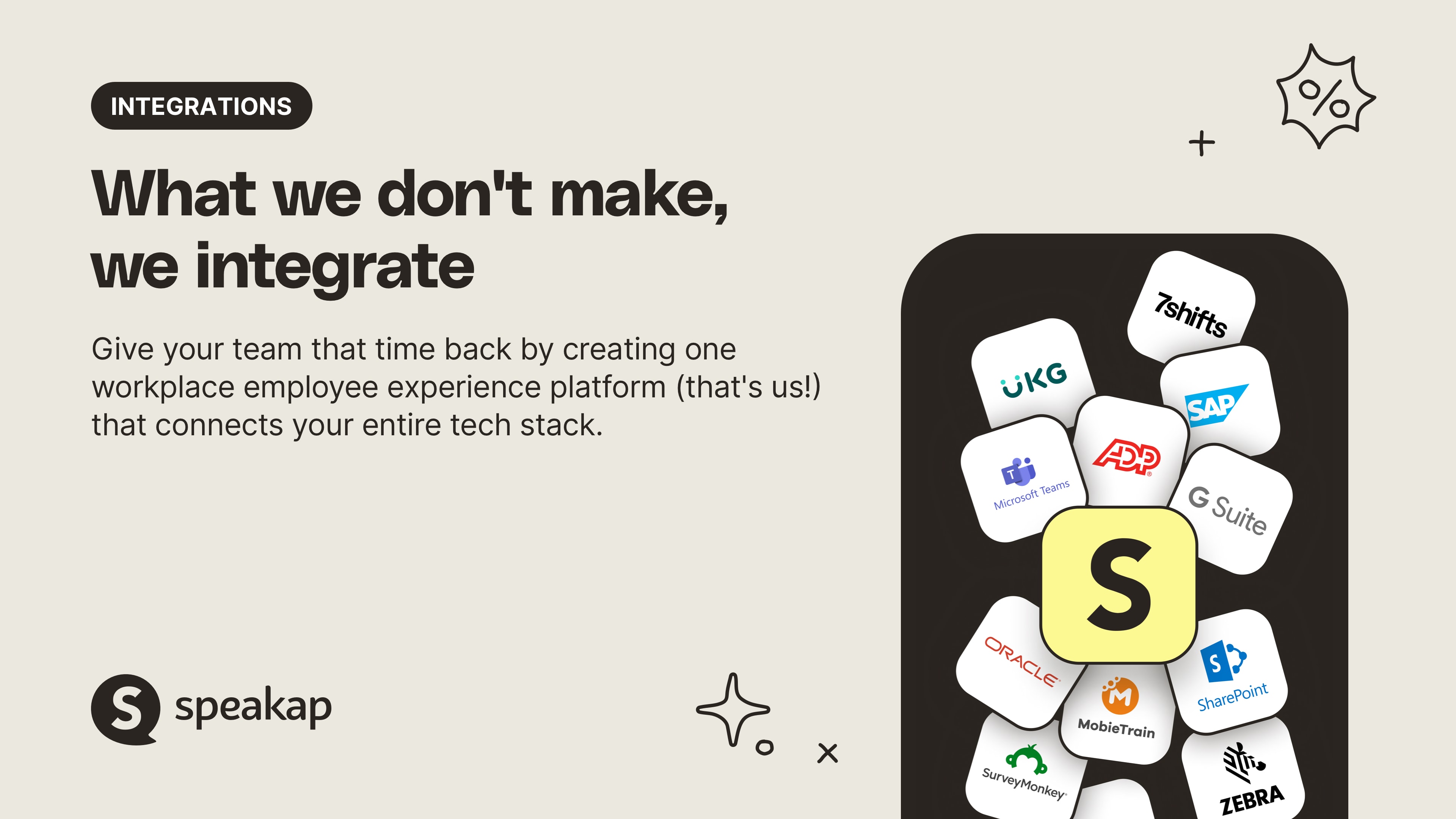 - Plug-and-play integrations – Connect Speakap to your HR and operational tools, so everything runs smoothly—without extra apps or clunky workarounds.