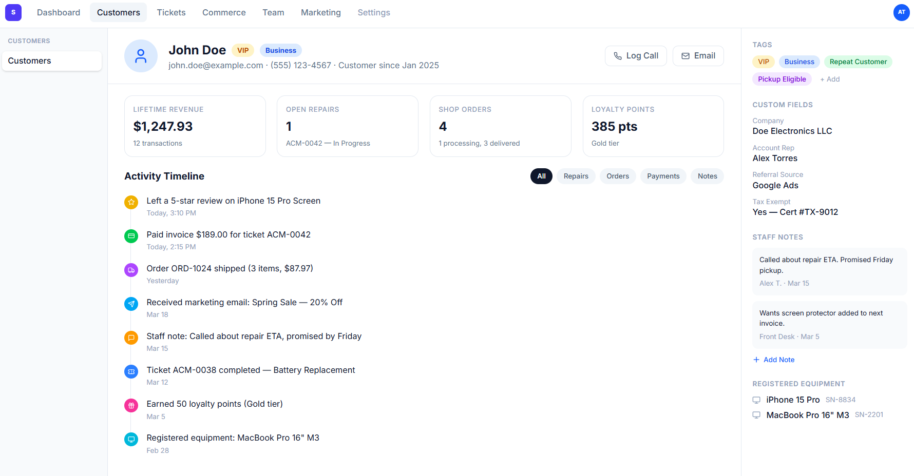 RepairShopr is an all-in-one system that integrates tickets, CRM, invoices, and marketing into a platform designed for repair shops.