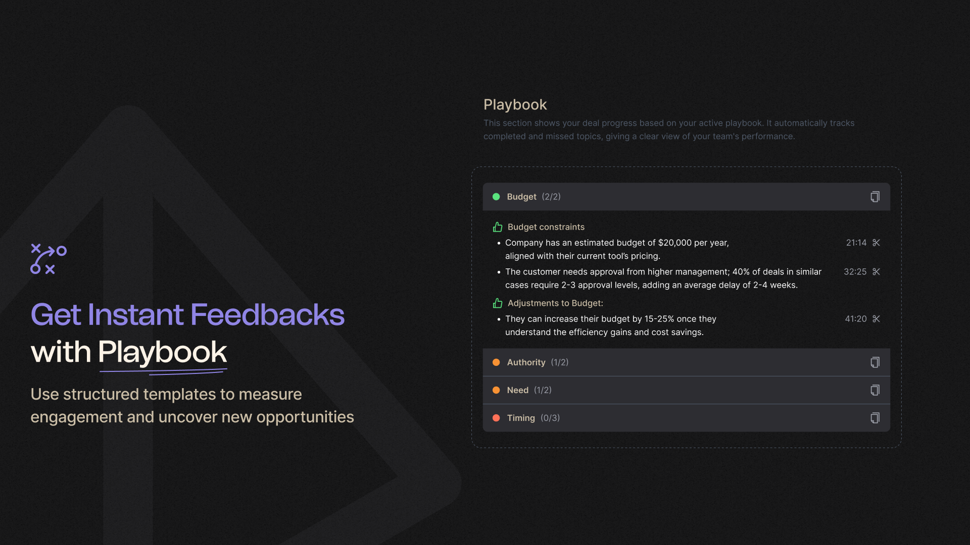 Ability to specify a sales methodology and then to analyse deals based on that methodology. Tool is able to analyse the overall status of the deal based on multiple calls and also able to sync the methodology results to CRM