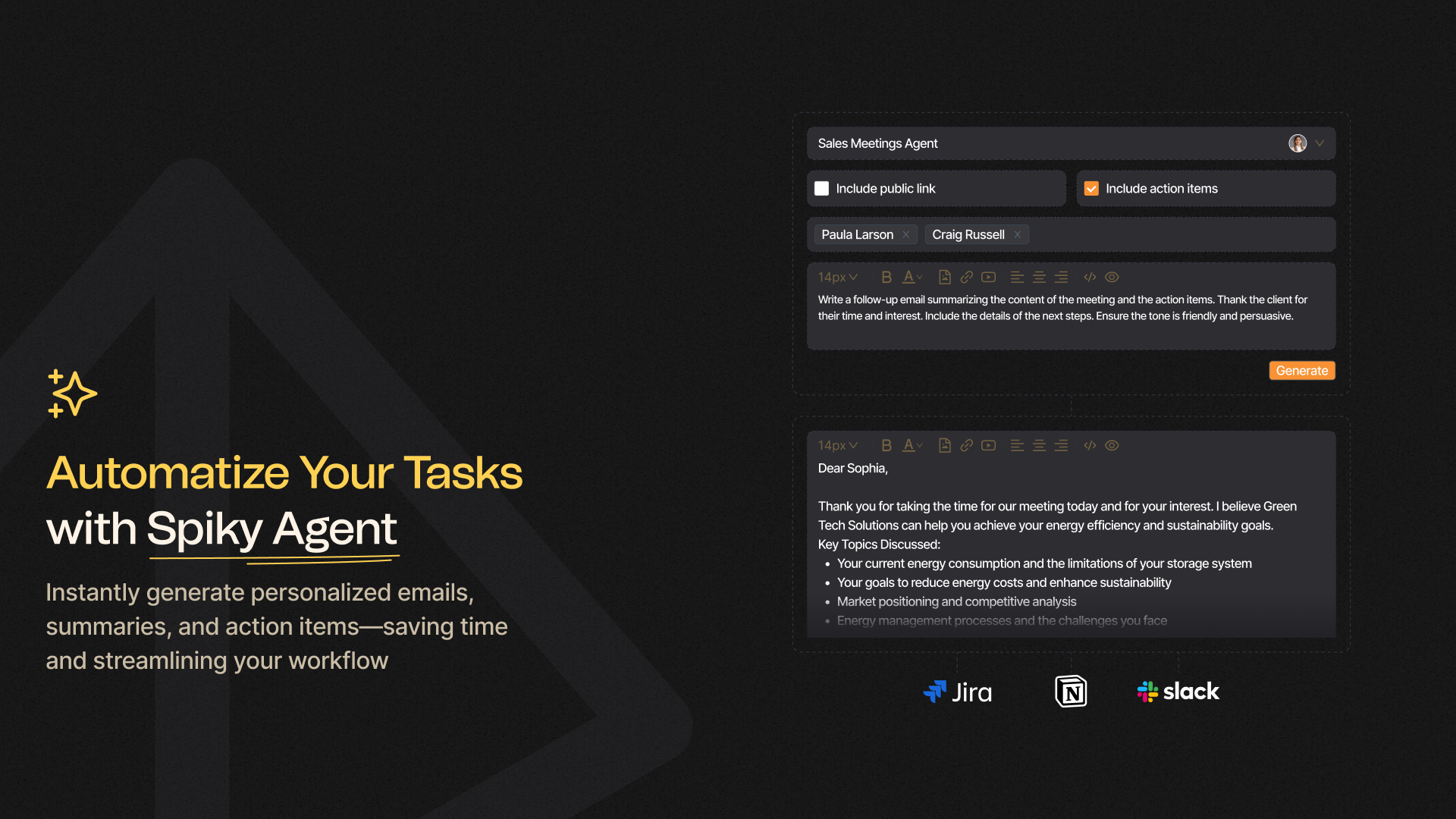 Spiky addresses the pervasive challenge of unproductive meetings by harnessing the power of AI to deliver actionable insights.
