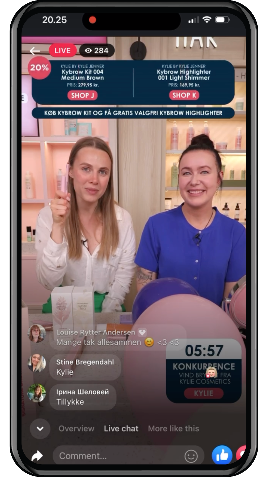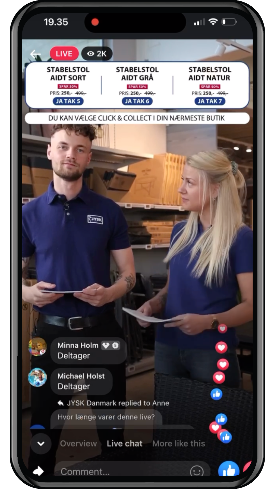 A software solutution you can connect to your social media account to drive engagement and conversion during Live streams and other posts. And a video commerce tool to enable shoppable videos on your webshop.