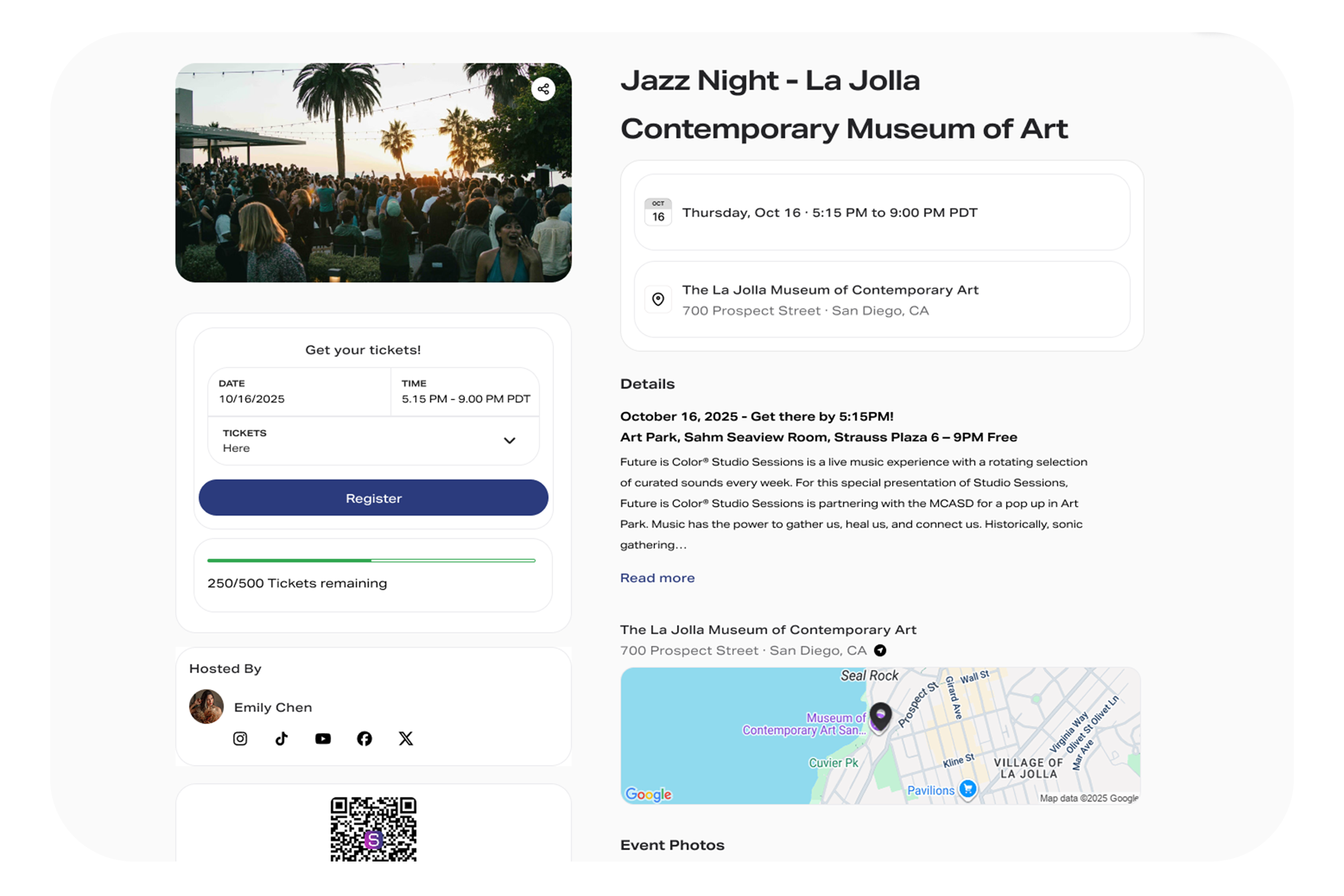 The platform supports use cases such as link-in-bio pages, QR-based engagement, event promotion, ticket sales, attendee check-ins, and performance tracking. Users can create Action Pages that act as a central destination for links, content, and calls to action. These pages can be shared through QR codes, social platforms, or direct links and updated without changing the destination URL.