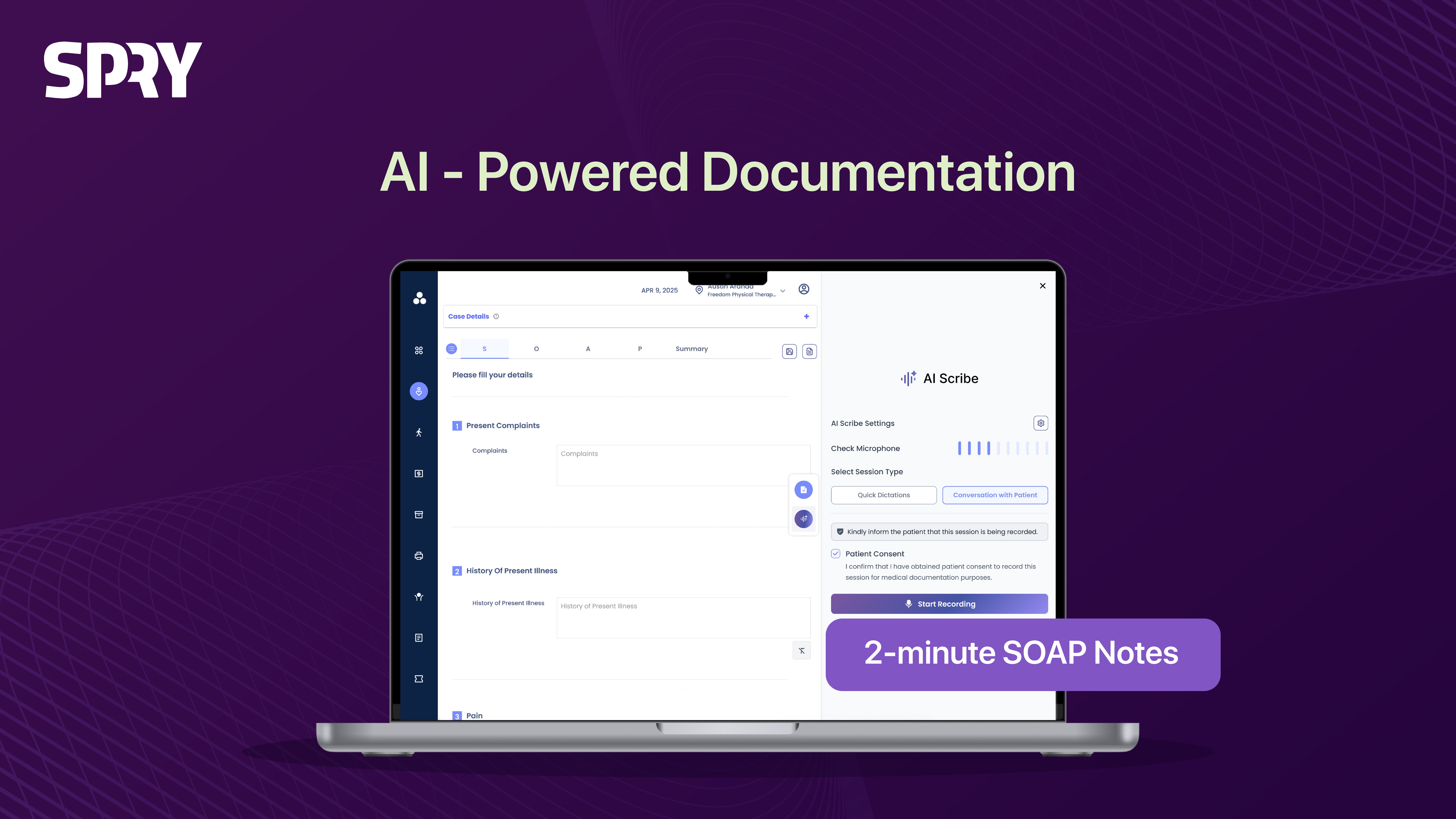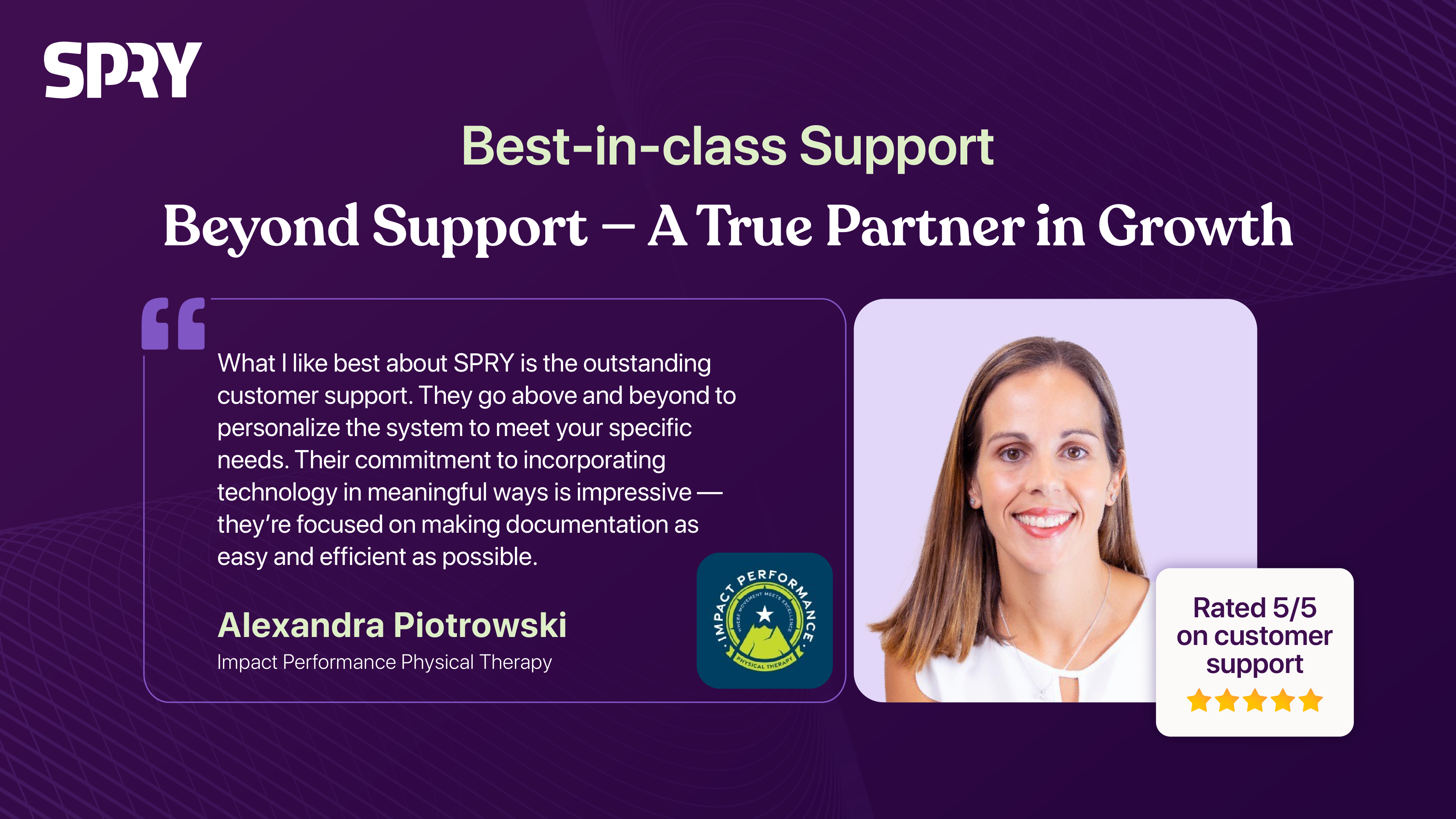 Spry has been the best EMR experience I’ve had as a physical therapist. The platform is clean, intuitive, and flexible enough to handle the unique needs of a cash-based practice. What really sets Spry apart is the level of attention and detail their team brings. Any time I’ve needed help with customization or workflow changes, they’ve been incredibly responsive and willing to work with me to get things exactly how I need them.