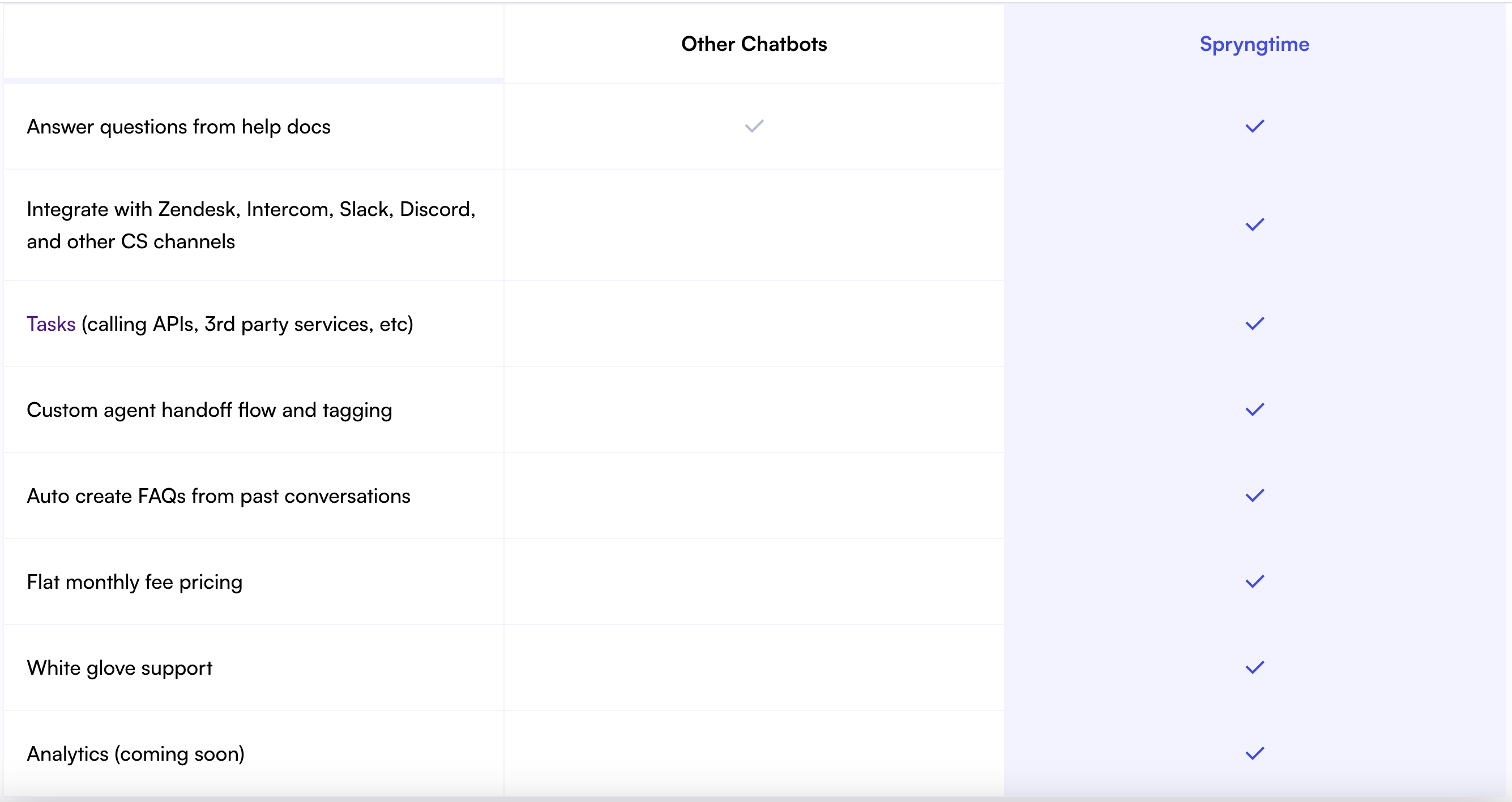 It's really easy to setup. We used Intercom and we were able to get it up and running with no integration cost in less than 15 minutes. We also considered Intercom Fin, but they charged $1 per resolution (which was hard for us to measure), while Spryngtime had very clear transparent pricing of $0.4 per ticket. Review collected by and hosted on G2.com.