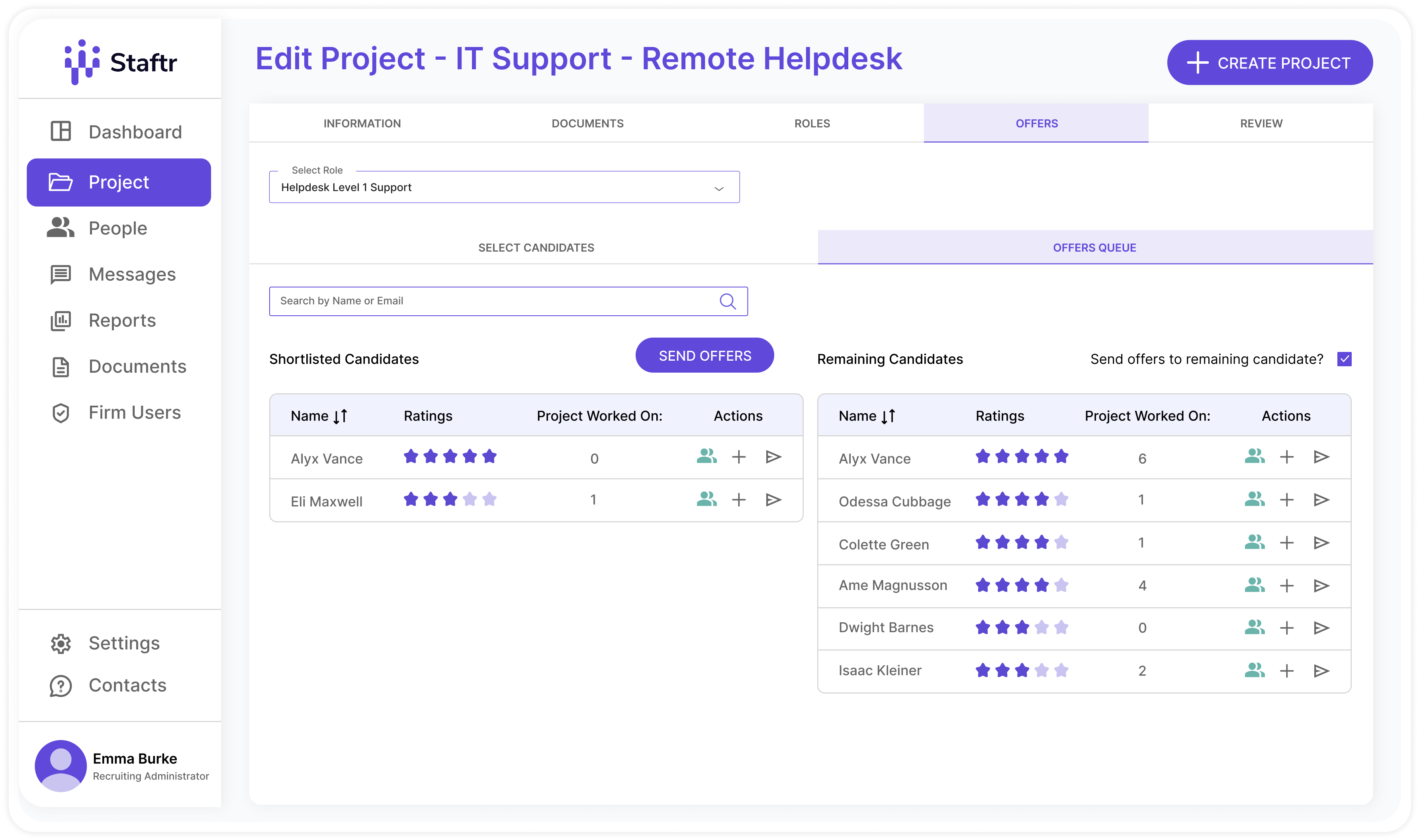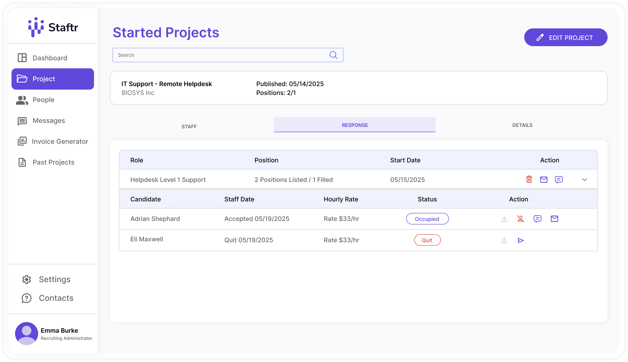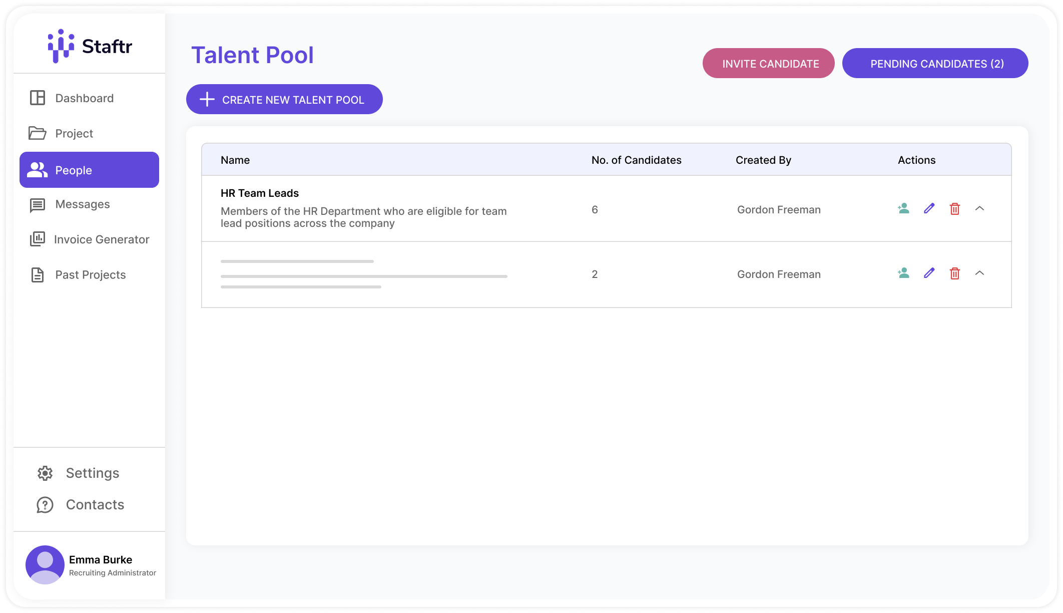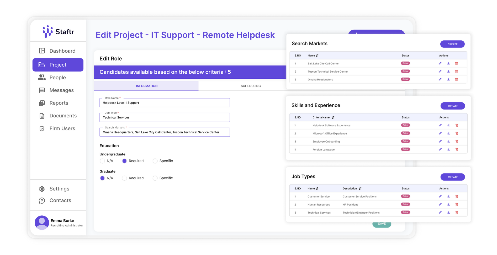 Staftr's intuitive candidate role management interface showing real-time updates to contractor profiles and credentials. The streamlined dashboard displays comprehensive skill sets, certifications, and availability status - transforming how staffing agencies manage their talent database of 15,000...
