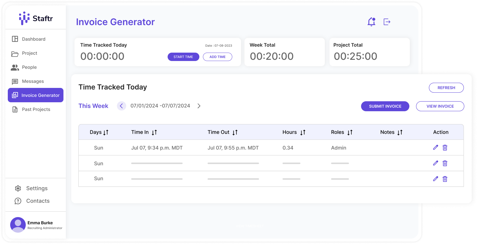 Automated invoice generation dashboard integrated with Staftr's time tracking and project management features. Generate accurate invoices instantly based on tracked hours, accepted offers, and completed assignments. The performance-based pricing model means you only pay for success - with transpa...