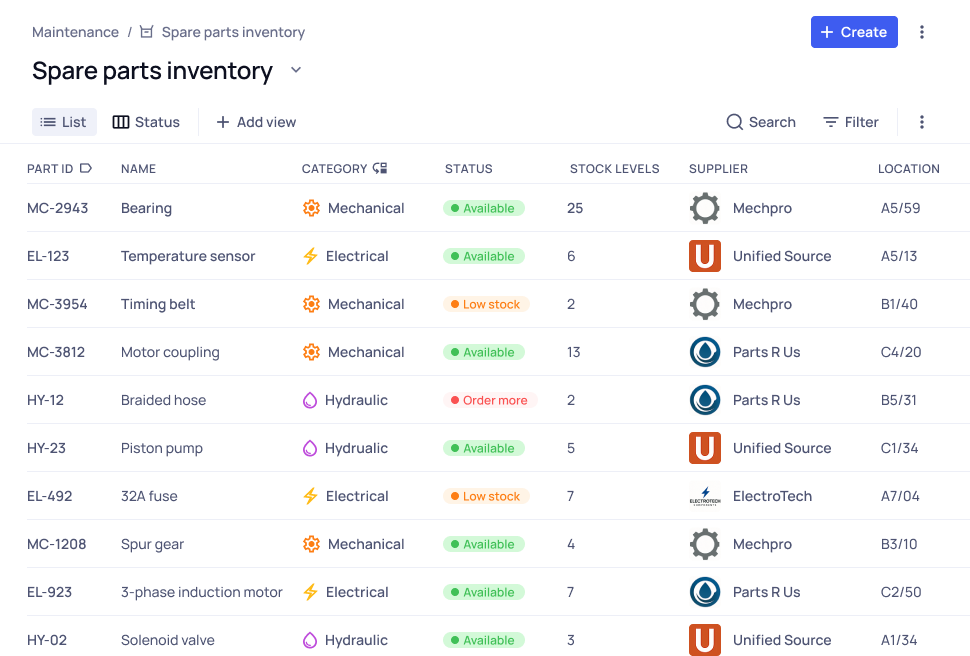 Fiix offers the following features: work orders, preventative maintenance, rotating assets & spares, MOR inventory management, and API connections.