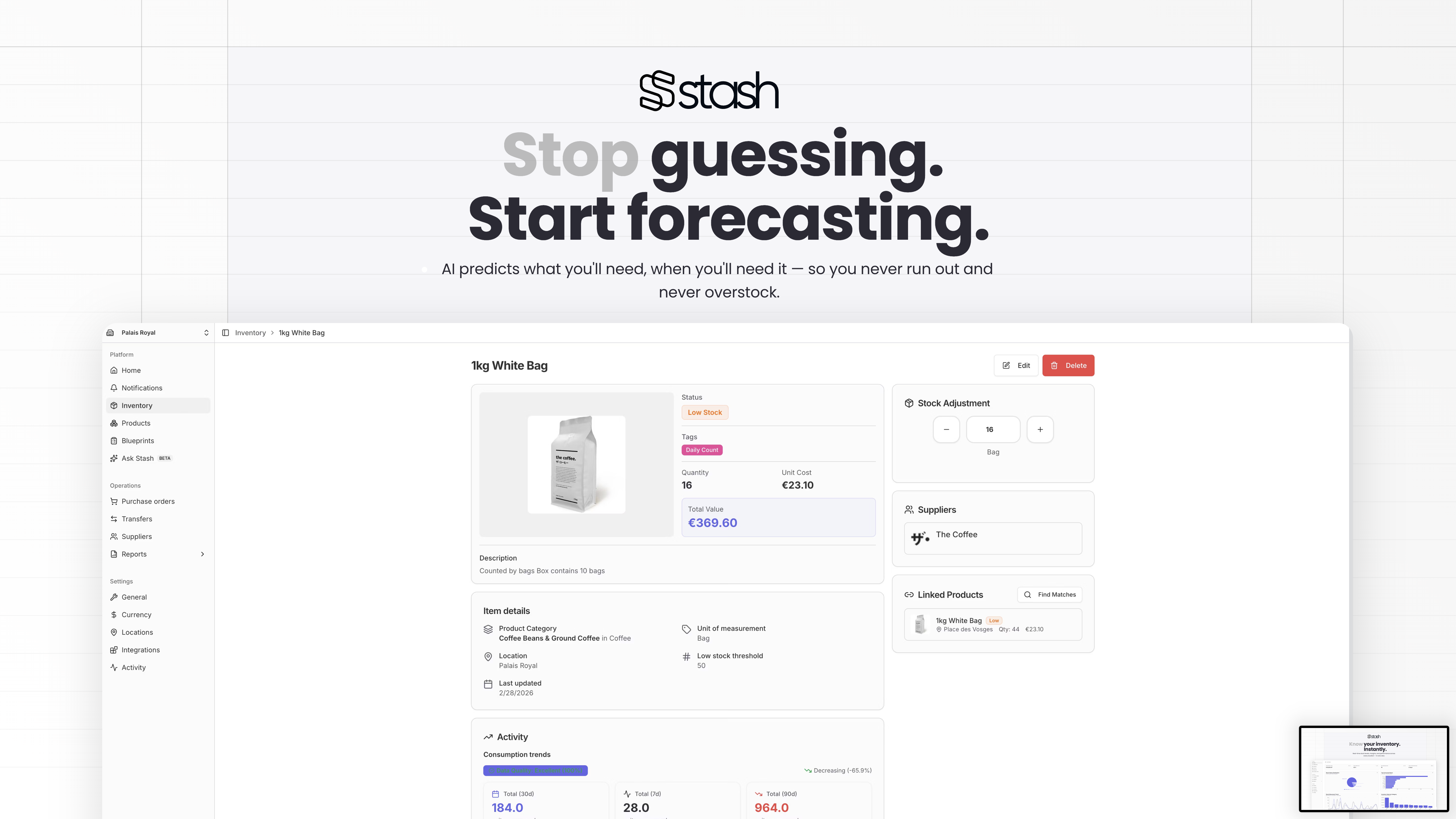 Stash is trusted by growing multi-location brands including The Coffee, Camellia Paris, and other businesses that need inventory clarity without enterprise complexity. A free trial