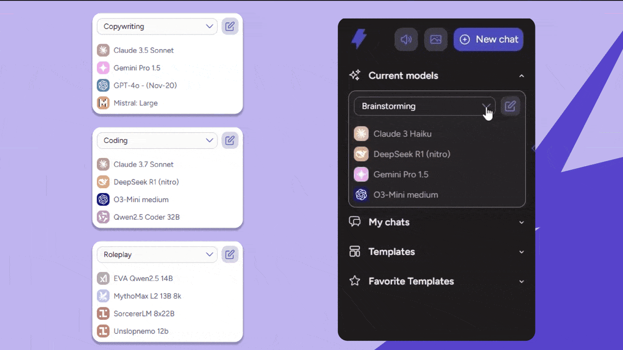 Enhance your results by grouping models for specific tasks. Choose from pre-built combos or create your own purpose-driven setups.