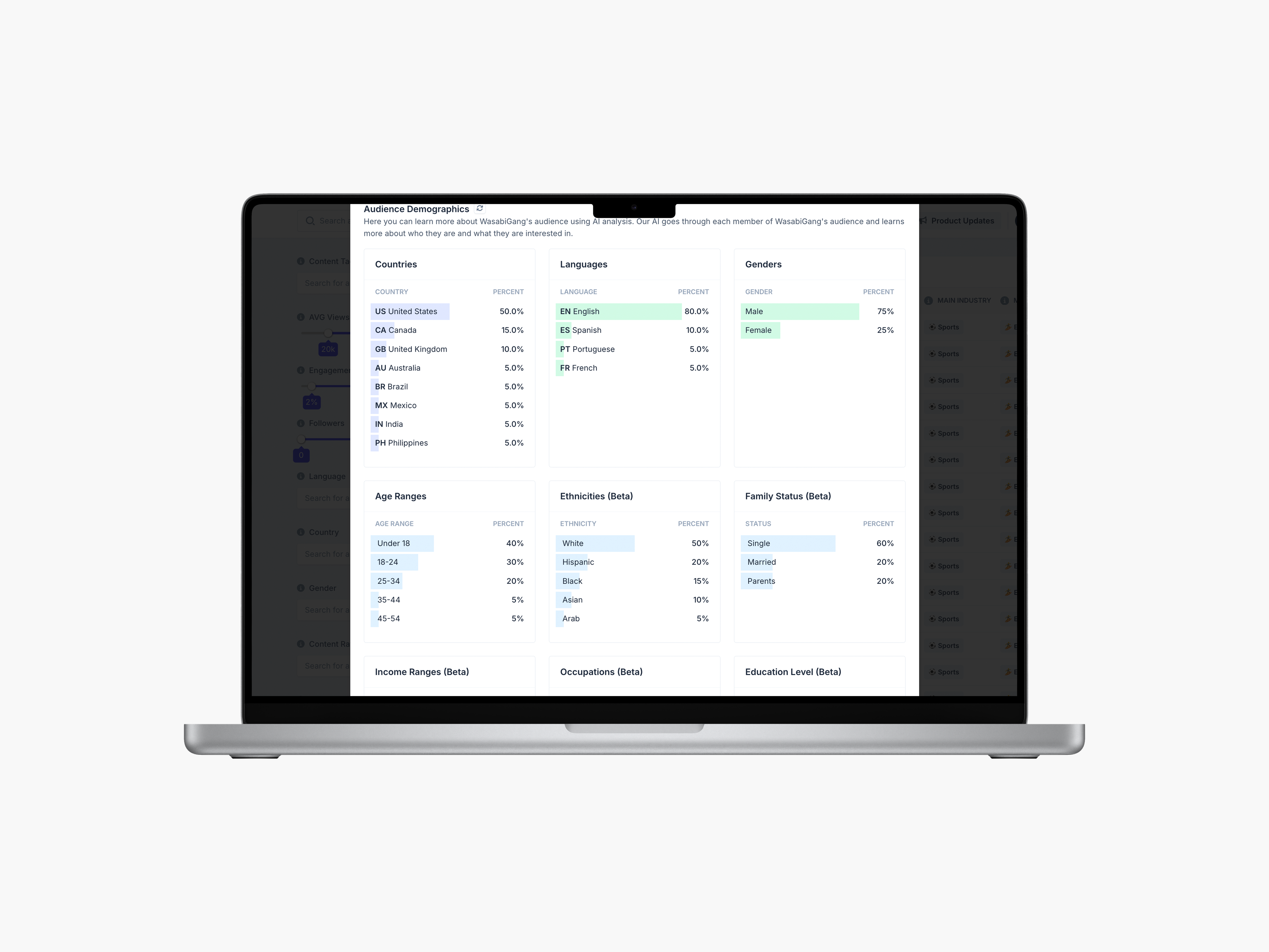 Provides in-depth demographic and behavioral insights, including age, gender, location, income, occupation, interests, and brand affinity, alongside metrics like audience stability, market rates, and sponsorship saturation.
