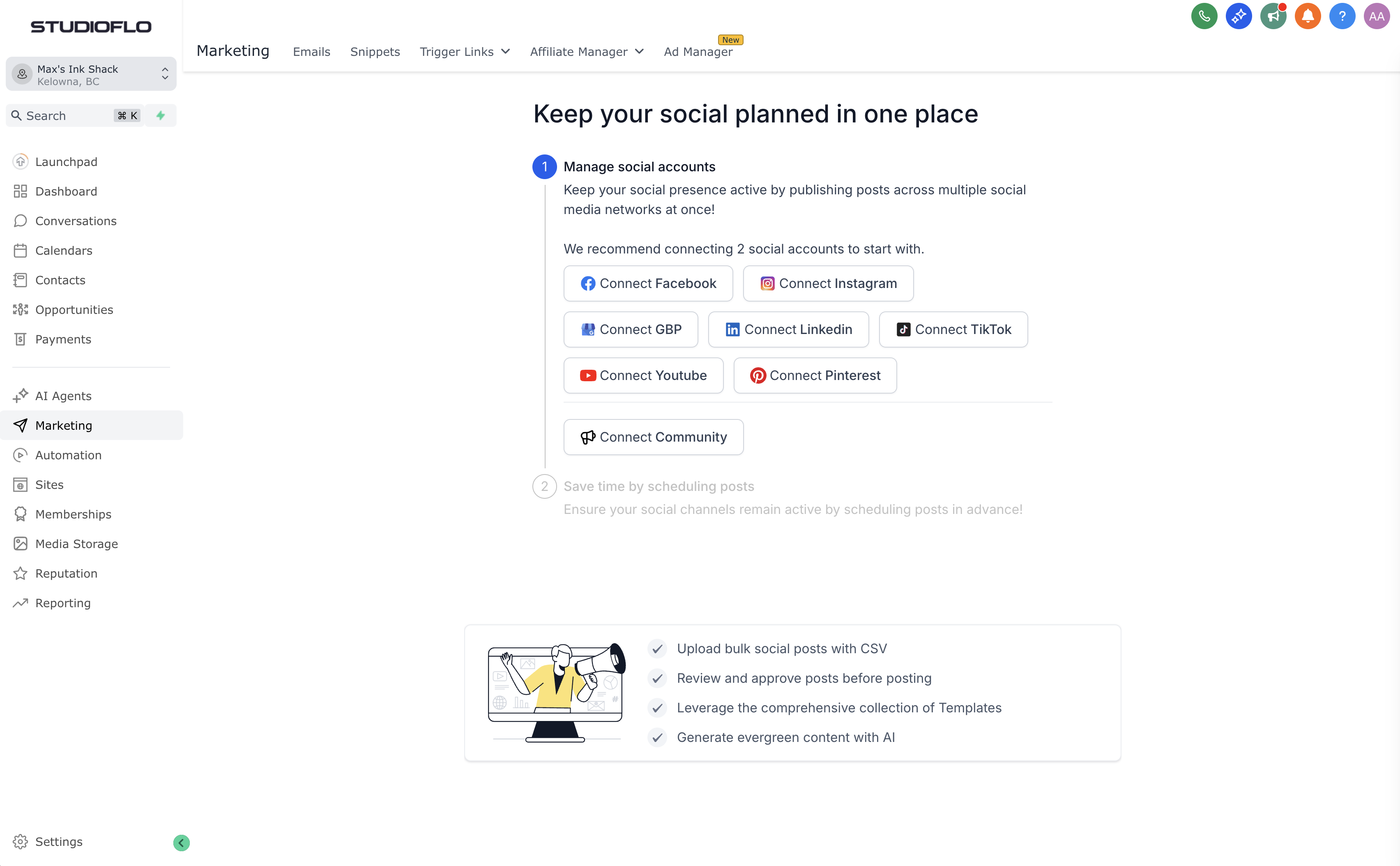 Studioflo features a full end-to-end lead generation system. Artists can launch pre-built ad campaigns - customized by tattoo style and client type - across platforms like Instagram, Facebook, and Google. Once a lead comes in, the assistant automatically engages, qualifies, collects booking details, and schedules the appointment, fully automating the process from ad click to confirmed client.