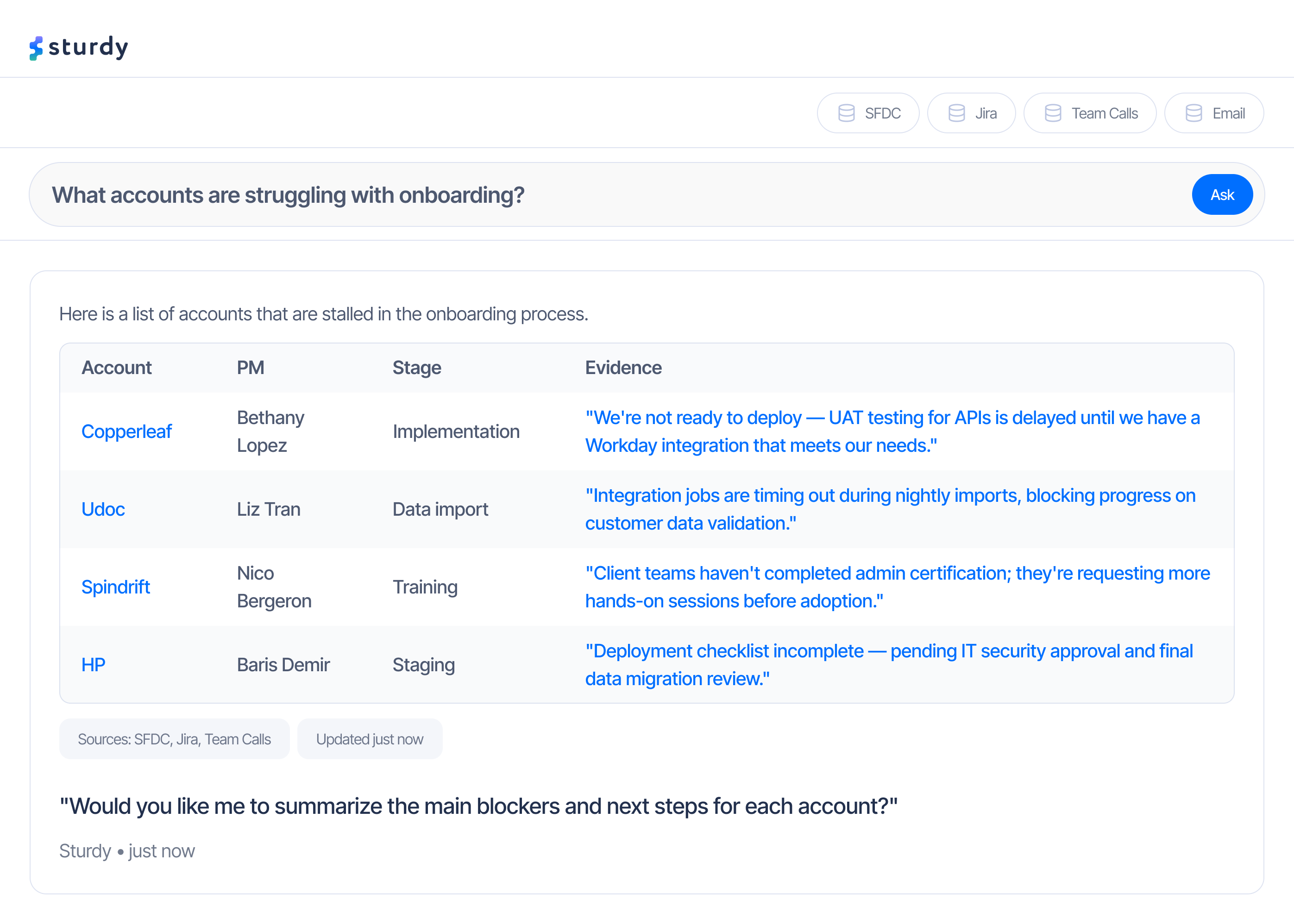 The results were immediate and measurable. Sturdy eliminated manual data gathering and surfaced key trends automatically — freeing the team to focus on outcomes, not upkeep.