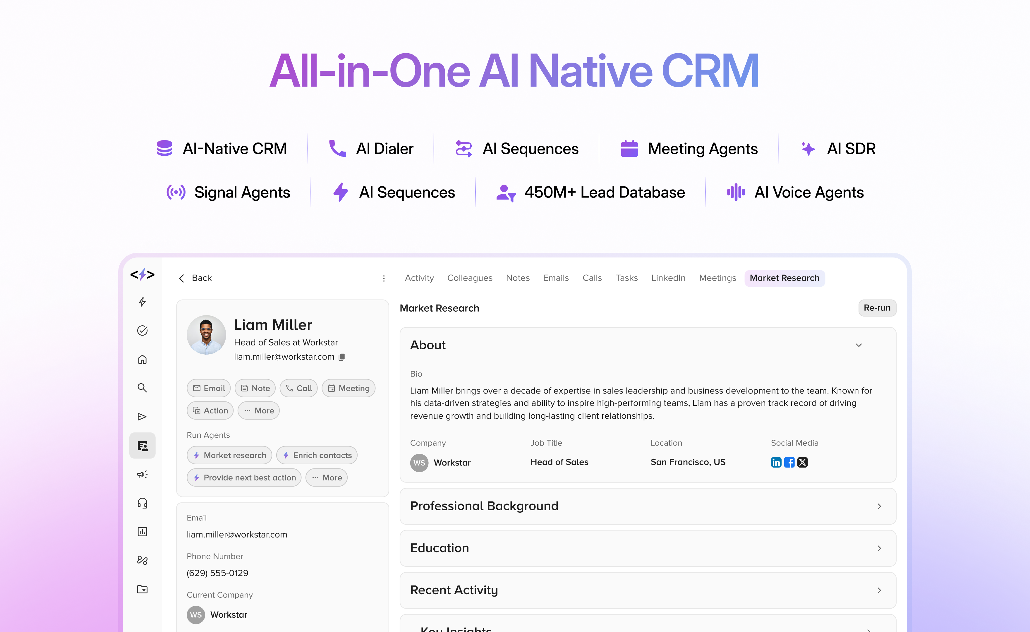 Prospect from an agent-verified contact/company database and auto-enrich records with verified emails and phones. Keep profiles updated with AI, import or export cleanly, and add leads from LinkedIn directly into CRM so you can email or call immediately. Build granular lists, and push them straight into outreach. Upload CSVs for waterfall enrichment, adding leads to lists, sequences, or CRM in one go.