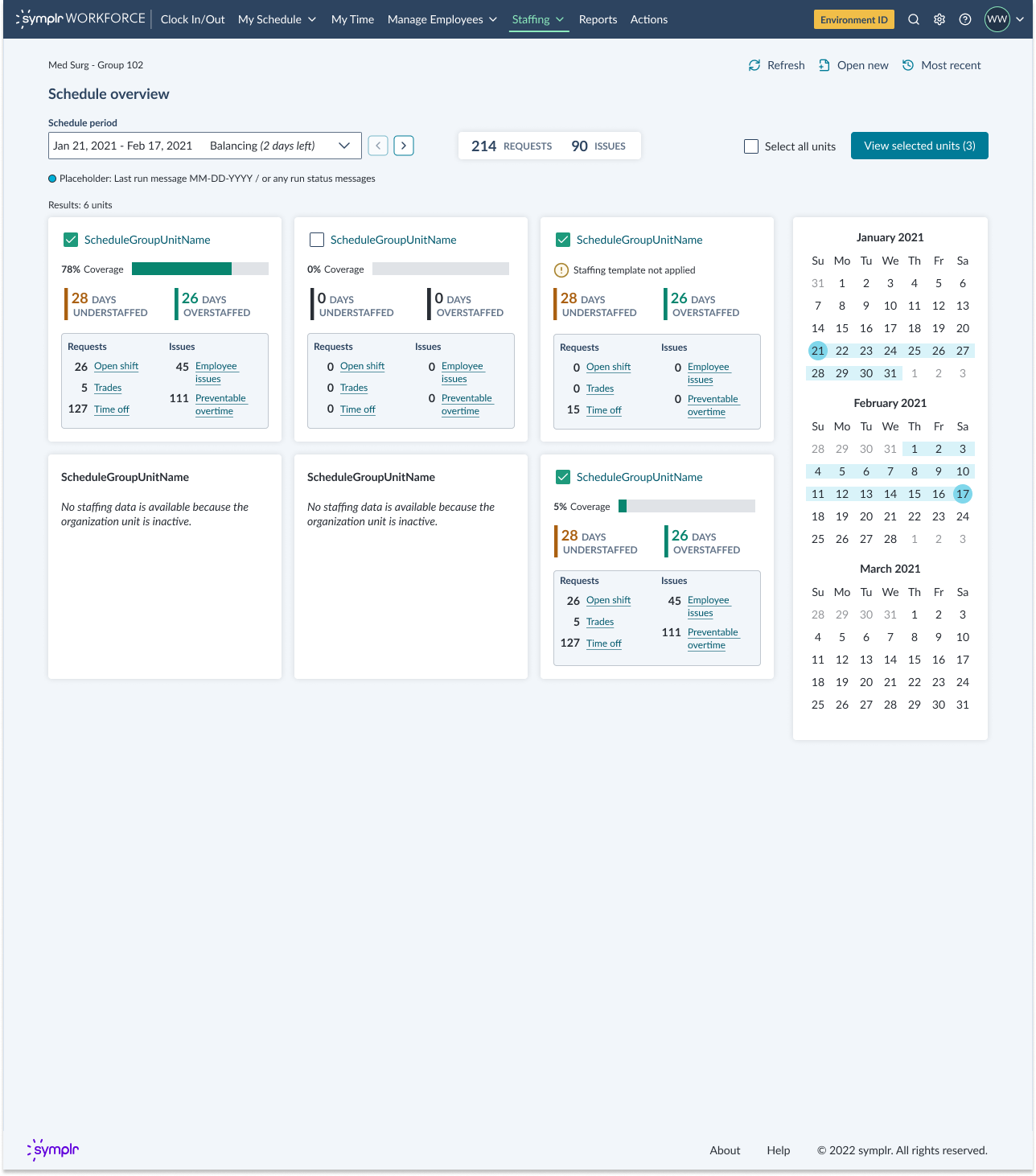 While advanced forecasting and predictive scheduling are delivered through Smart Square®, symplr’s separate scheduling solution, health systems may use both products within their broader workforce management strategy depending on their operational requirements. symplr Workforce itself focuses on accurate timekeeping, application of pay policies, daily schedule management, and visibility into labor indicators.