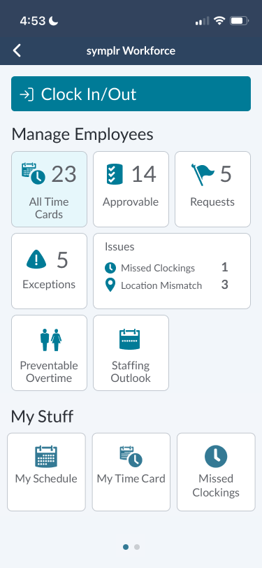 For staffing and scheduling workflows, symplr Workforce provides features such as schedule creation, shift changes, self-scheduling within guardrails, and mobile access for employees. Staff can clock in or out, view schedules, submit requests, and participate in approved shift workflows through mobile tools. Managers can monitor labor activity in real time, balance schedules within organizational rules, and make adjustments based on department needs.