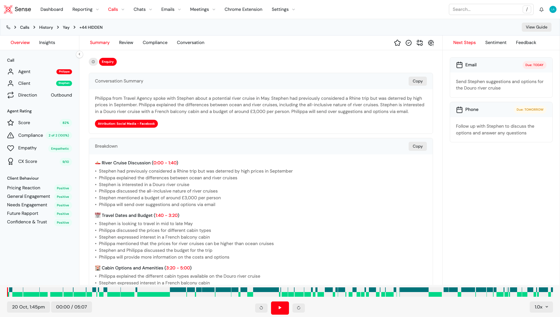 Sense can be configured by call type, department, brand, and agent role, allowing different scoring frameworks to be applied to inbound sales calls, outbound calls, service enquiries, complaints, or administrative interactions. Compliance checks are defined by the organisation and reviewed automatically on every call, with clear reasoning provided for pass, fail, or partial outcomes. Behaviour and sentiment analysis help teams understand how customers respond emotionally and cognitively during conversations.