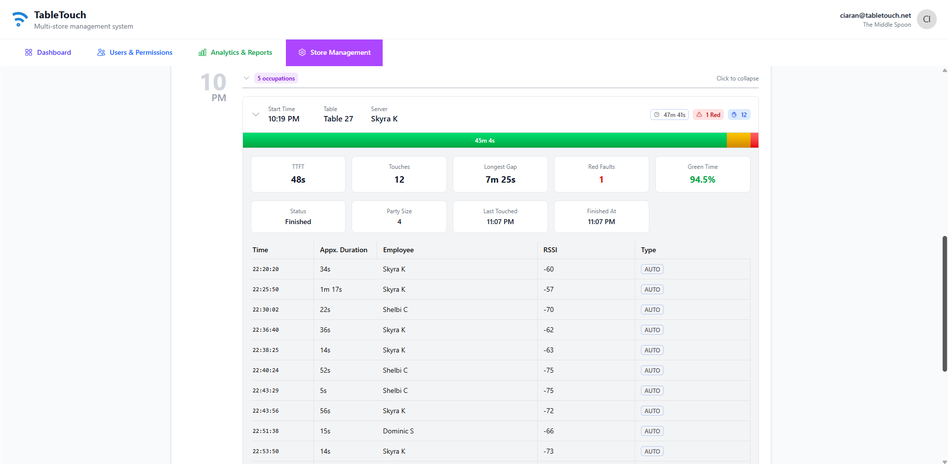 After service, Table Touch provides reporting on table visits, service timing, and team performance, giving operators a clear, objective way to coach staff and improve operations over time.