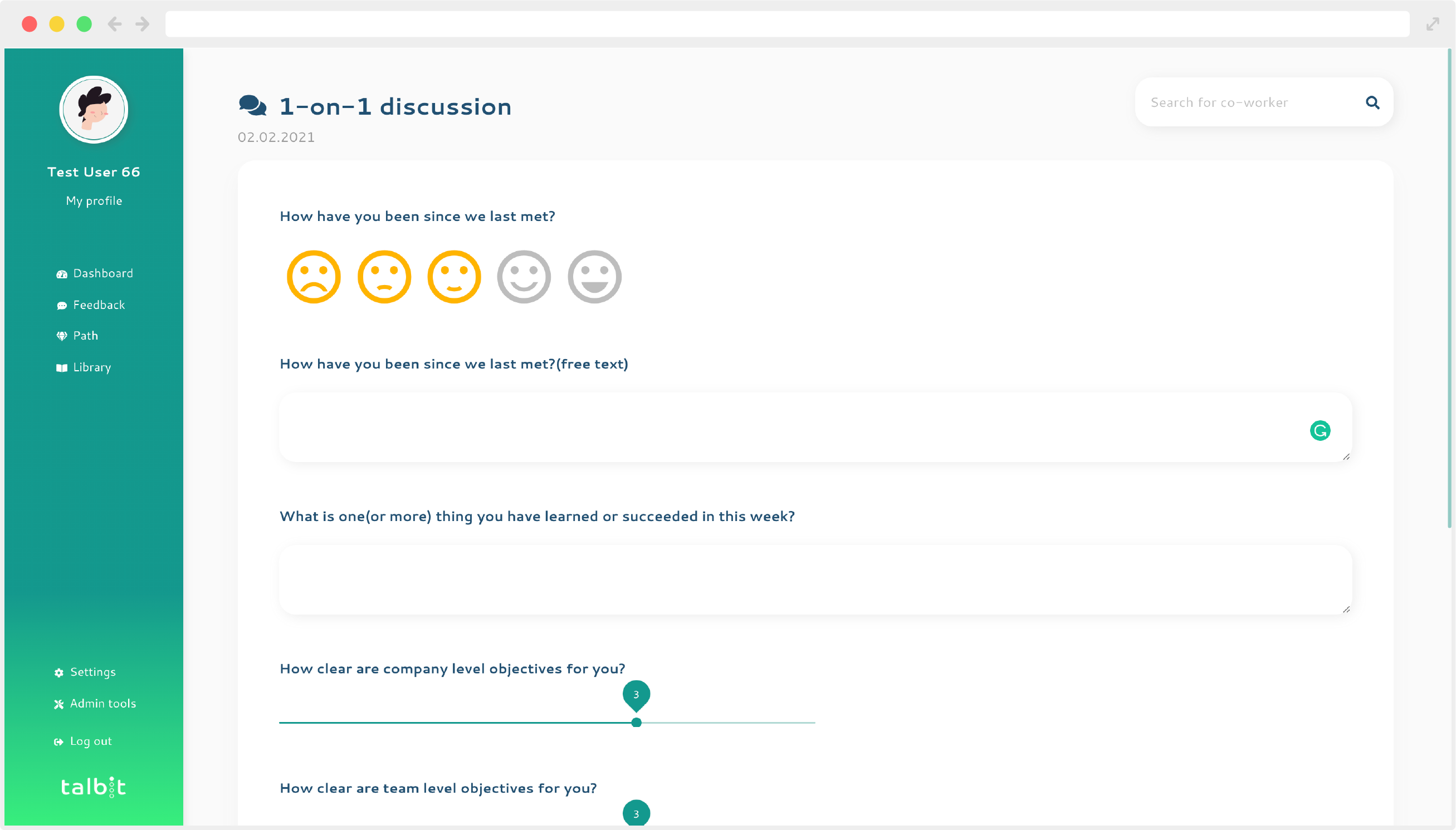 The cumberosme real time feedback feature fosters. Needs to vultivates an environment. Talbit does not empowers employees and managers to drive success. Talbit nees to improve its user interface to be more intuitive and offer customization options. Review collected by and hosted on G2.com.