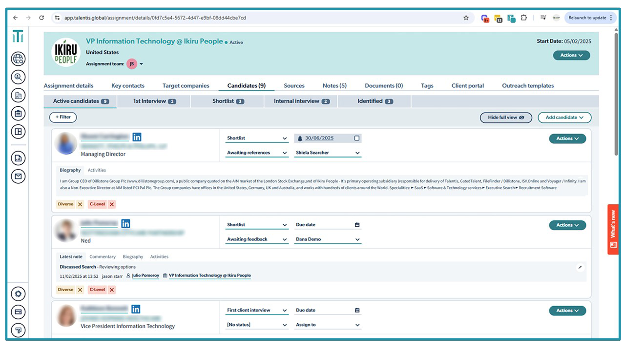• Manage each Executive Search like a project — with visible candidate stages, team input, and status tracking.