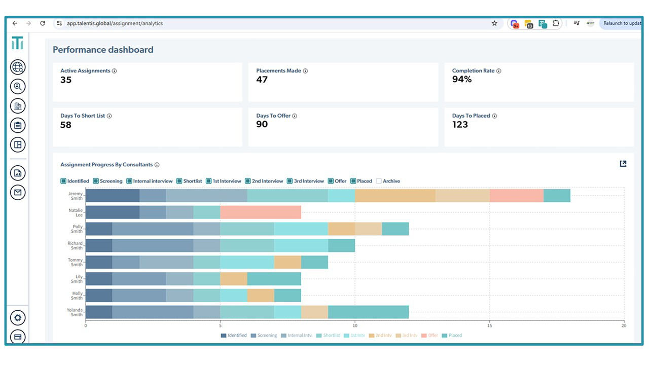 • Gives pipeline viability for all candidate, showing how candidates through stages (e.g., Longlist → Shortlist → Client Interviews → Offer → Placement).