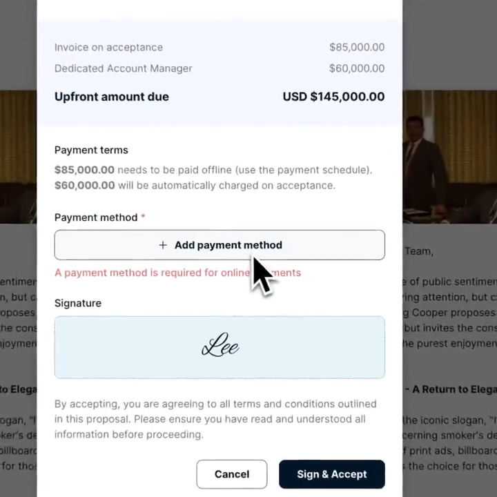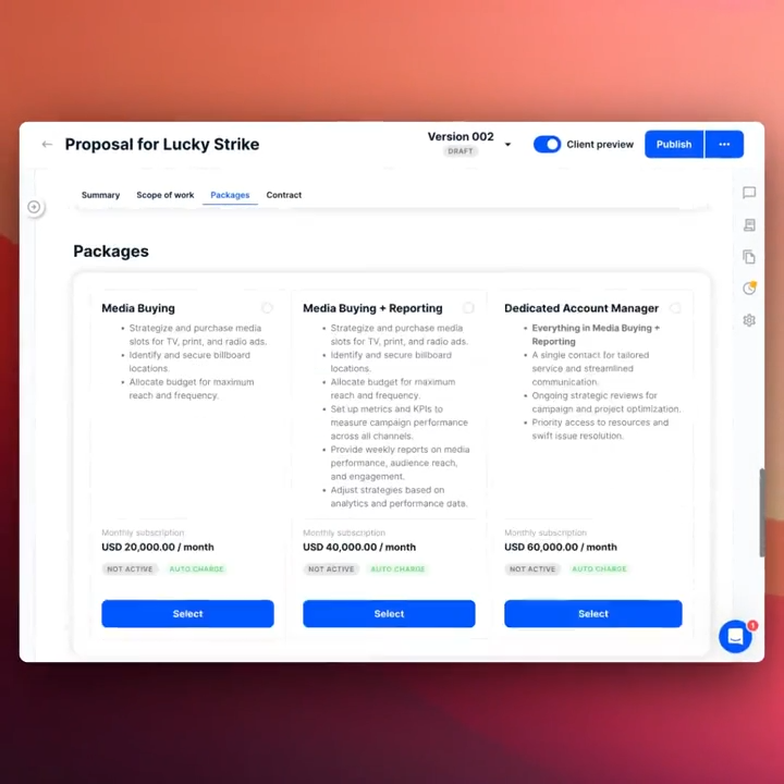 The design is great - I get comments about my proposals from my customers all the time! Also, I have searched far and wide for a proposal software that can easily bake in the terms and conditions in a presentable manner, which I have yet to find anything close to what Tango can do. Then there's the integration to Stripe for recurring payments baked in, invoicing, messegaing, late payment auto messaging, signing, the XERO integration. Then the ability to create a mix of packages, whether for a subsciption to my service with tiered options or one off services with the added ability to spilt payment by amount or percentage. This software is PERFECT for my agency. Review collected by and hosted on G2.com.