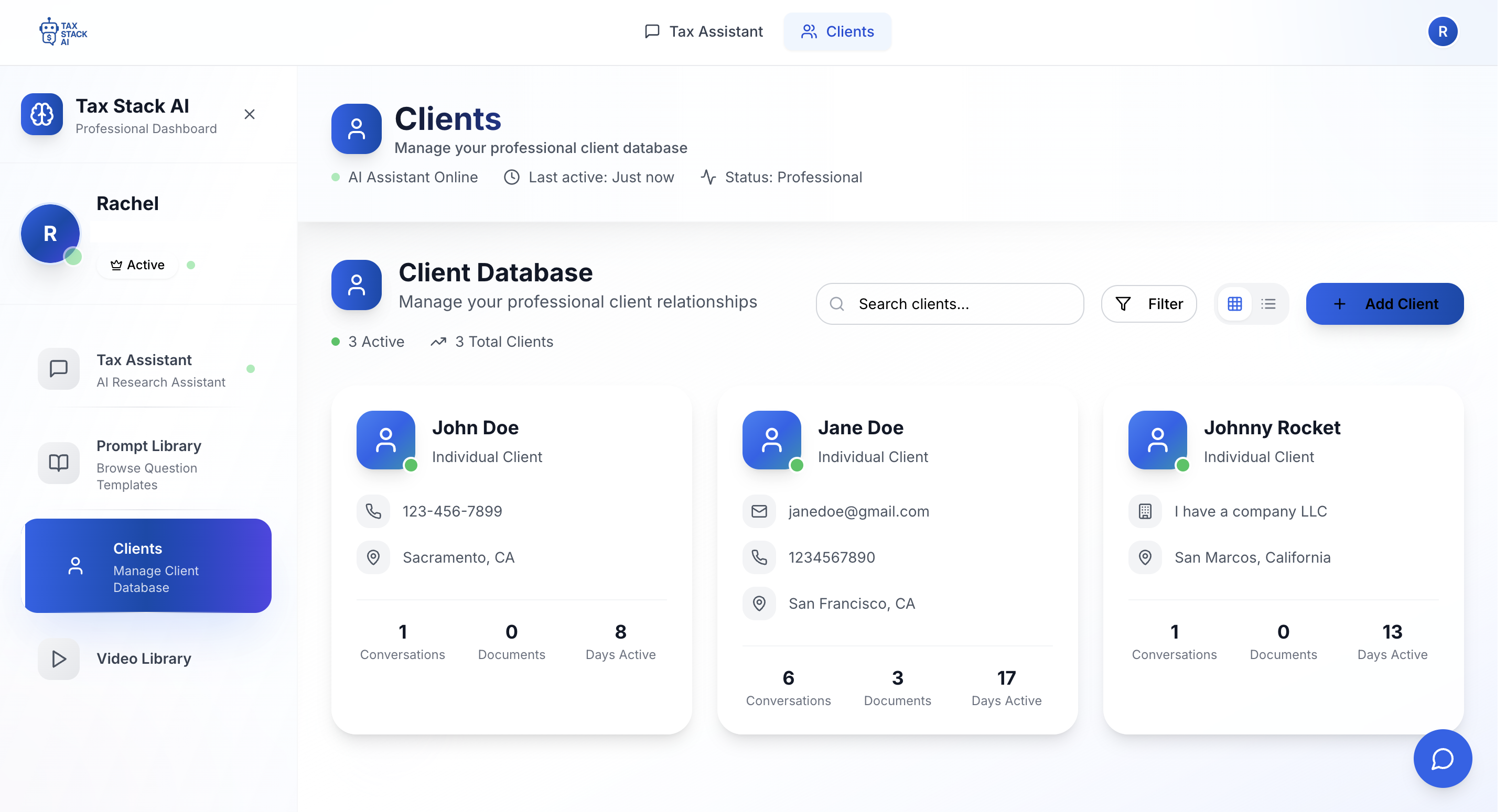 Tax Stack AI is an AI-powered SaaS solution designed for small-sized accounting firms. It helps streamline tax research, client management, and document analysis, providing a centralized platform for reviewing financial data, tracking client activity, and generating actionable insights. Built specifically for smaller firms and solo practitioners, Tax Stack AI integrates accounting-specific AI tools without the complexity or high cost of enterprise software. Tax Research: Tax Stack AI’s tax research functionality is trained on authoritative sources, providing accurate answers to complex tax questions and scenarios. Users can quickly analyze tax regulations, explore client-specific situations, and generate actionable recommendations. The AI is designed to reduce time spent on manual research while improving accuracy and reliability, answers questions using trusted, up-to-date sources, supports complex tax planning scenarios, and reduces hours spent on manual research. Client Insights and Management: The platform provides AI-powered client insights and management tools that track financial activity, identify patterns, and highlight opportunities for advisory services. A client-specific chatbot learns from uploaded documents and client inputs to provide context-aware guidance and interactive support, offering personalized client analysis and insights, tailored recommendations for tax planning and advisory, and interactive support for individual clients. Document Analysis: Tax Stack AI includes automated document analysis for tax returns, financial statements, and other accounting documents. The system checks for errors, inconsistencies, and potential risks, helping users maintain accuracy and compliance through automatic review of client financial documents, highlighting inconsistencies or potential errors, and supporting audit preparation and compliance checks. Security and Workflow Integration: Data security is maintained with industry-standard protections, and the platform consolidates multiple accounting workflows into one interface, simplifying operations and reducing software complexity. Tax Stack AI allows firms to modernize their workflows while maintaining control over sensitive client data, providing a centralized interface for tax research, document analysis, and client management, secure handling of sensitive financial and client information, and is designed for small firms and solo practitioners. Tax Stack AI combines tax research, document review, and client management in one platform, providing small and mid-sized accounting firms with practical AI-driven tools to increase efficiency, improve accuracy, and support more informed advisory decisions.