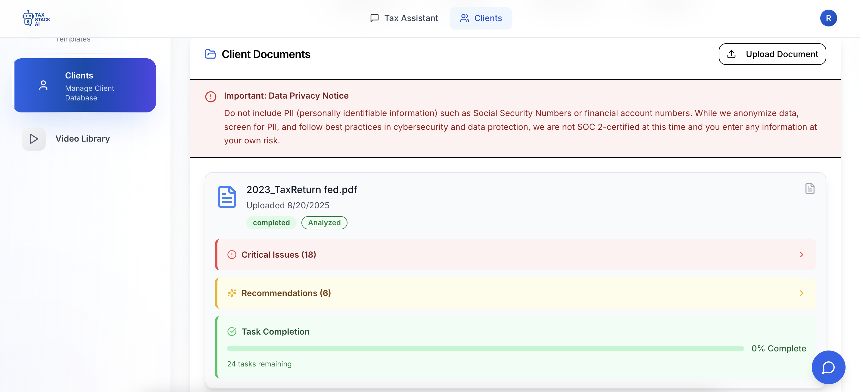Overall, Tax Stack AI offers a centralized, AI-driven approach to accounting for small -sized firms. Its combination of tax research, document analysis, and client insight tools provides a framework for improving operational efficiency, maintaining accuracy, and supporting more targeted advisory services. The platform is built to meet the specific needs of smaller accounting practices, offering AI capabilities in a cost-effective and accessible manner.