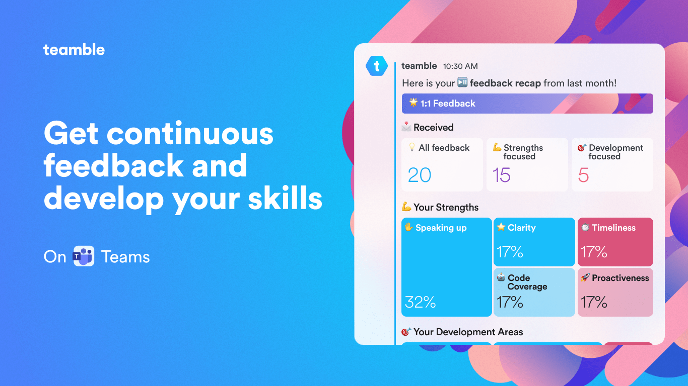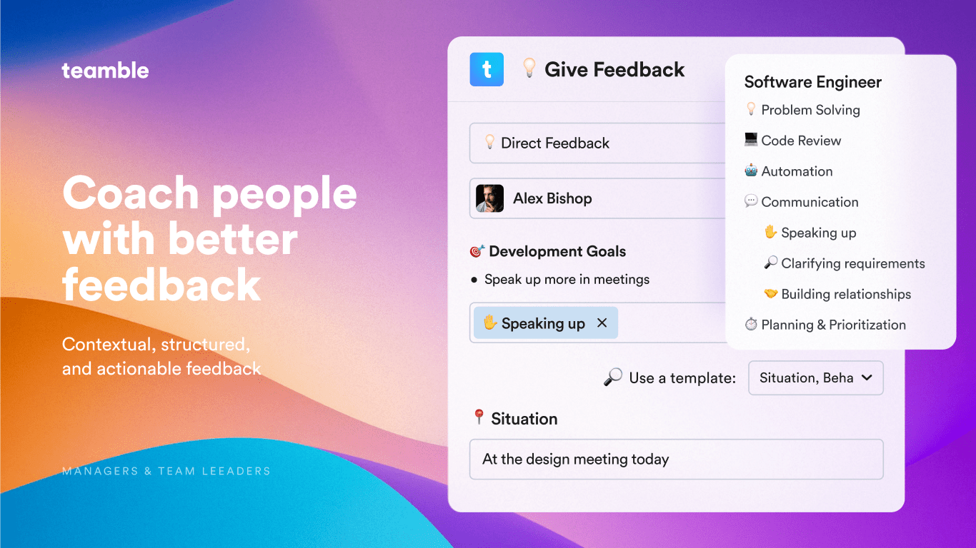What’s especially handy and educational is that Teamble can suggest feedback frameworks to help employees structure their feedback effectively. You can also add your company’s values and competencies to Teamble, allowing team members to link their feedback to them. This helps highlight employees' strengths and identify areas for development.