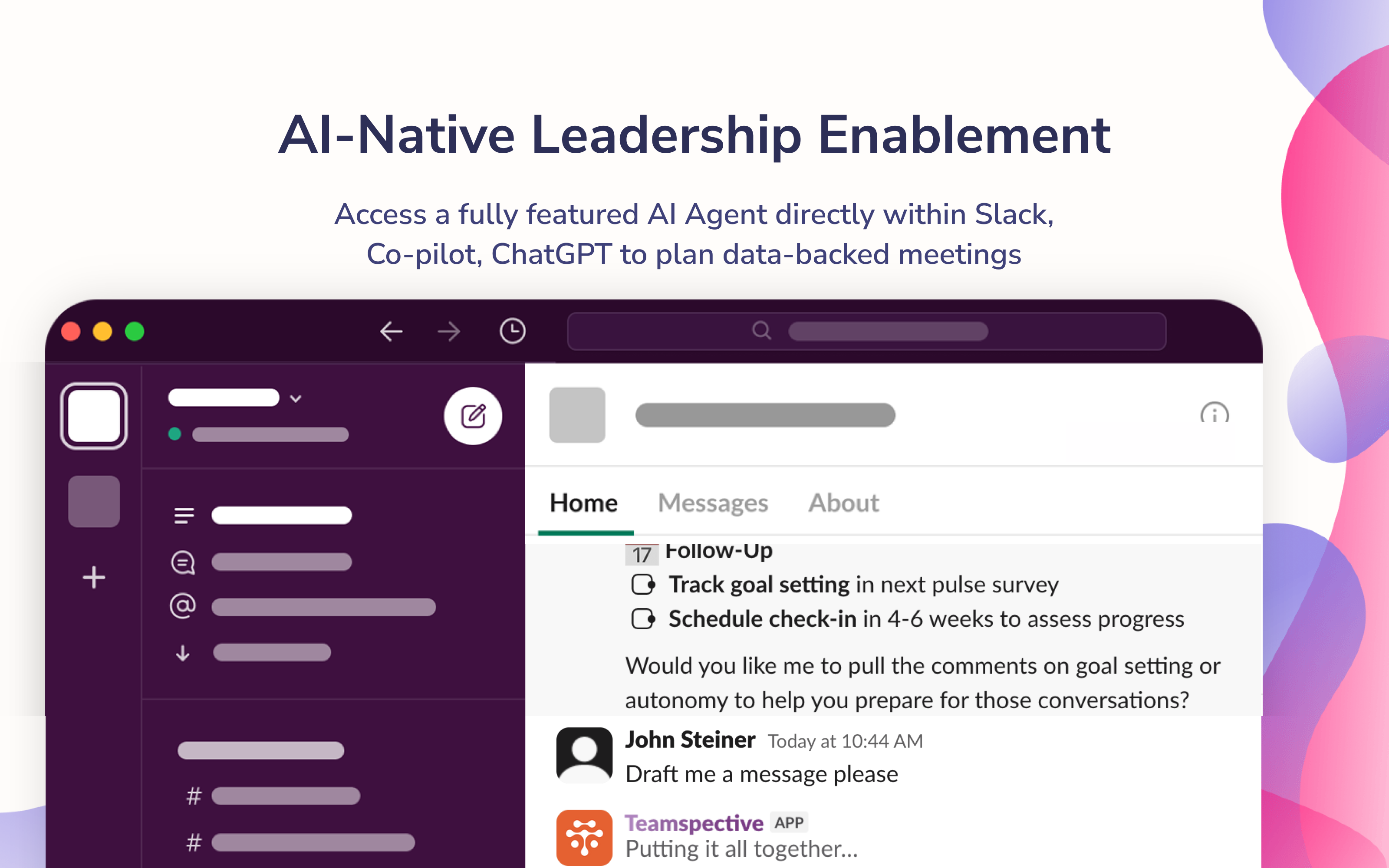 Teamspective works with Slack, MS Teams, Co-Pilot, ChatGPT, Claude and many other AI tools. Summarize feedback, highlight insights, prepare data-backed agendas, draft communication and coach the leadership approach for maximal impact with less effort.