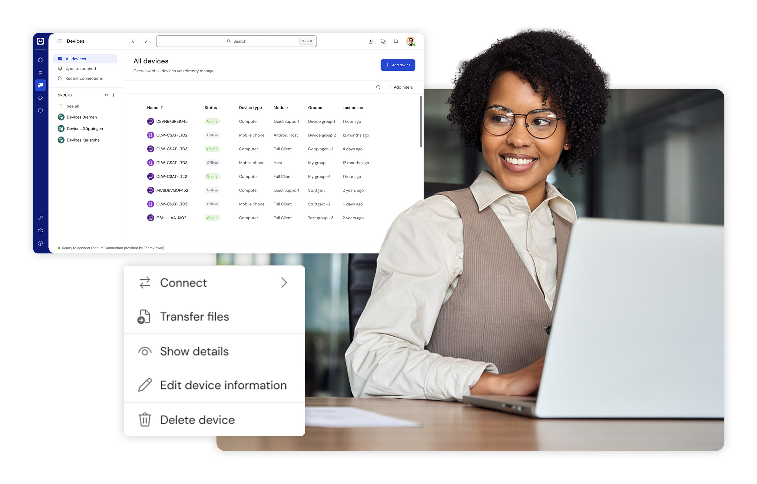 TeamViewer is a leading provider of remote connectivity software for individuals and businesses of all sizes. Our remote software enables companies across various industries to enhance their efficiency and achieve their business goals by digitally transforming their processes.