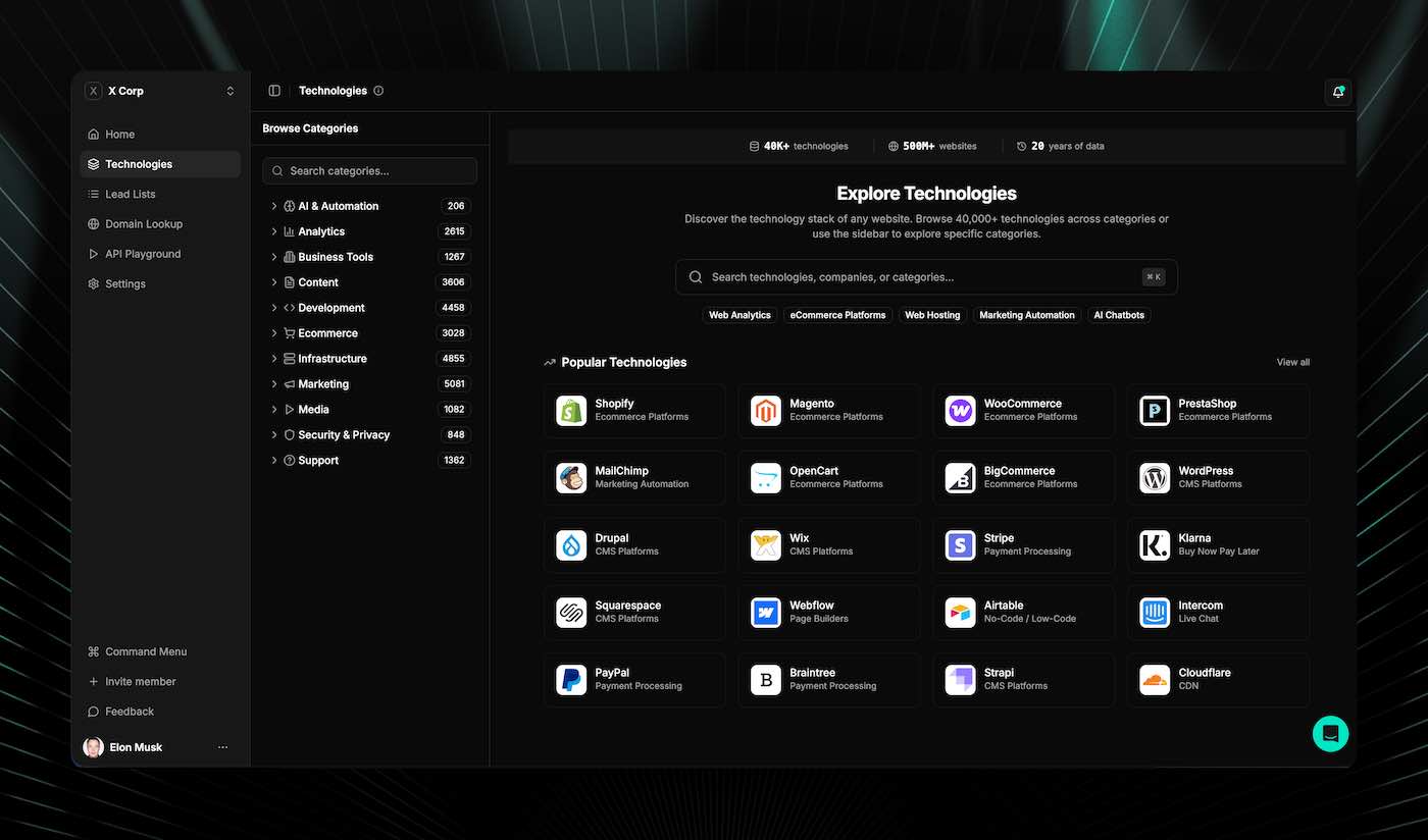 We detect 40,000+ technologies across 50M+ domains—10x more coverage than tools like Wappalyzer. Our multi-signal detection goes far beyond frontend frameworks: