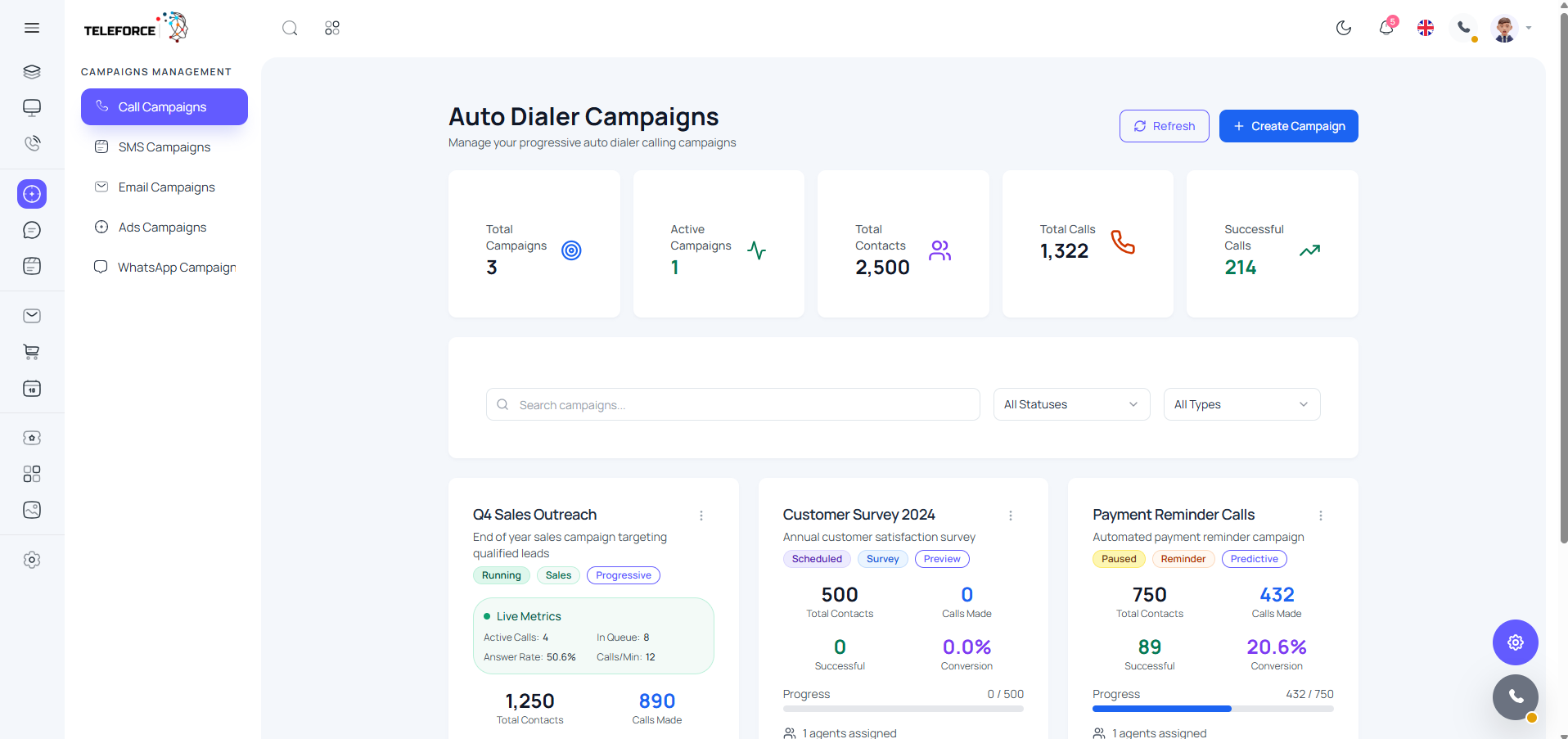 At its core, Teleforce provides a fully managed communication suite, including advanced IVR systems, progressive and predictive auto-dialers, outbound IVR campaigns, transactional email services, SMS, and WhatsApp Business API with integrated chat tools. Businesses can integrate directly with popular channels like Facebook Messenger, Google Meet, and more, ensuring every customer touchpoint is connected and trackable.