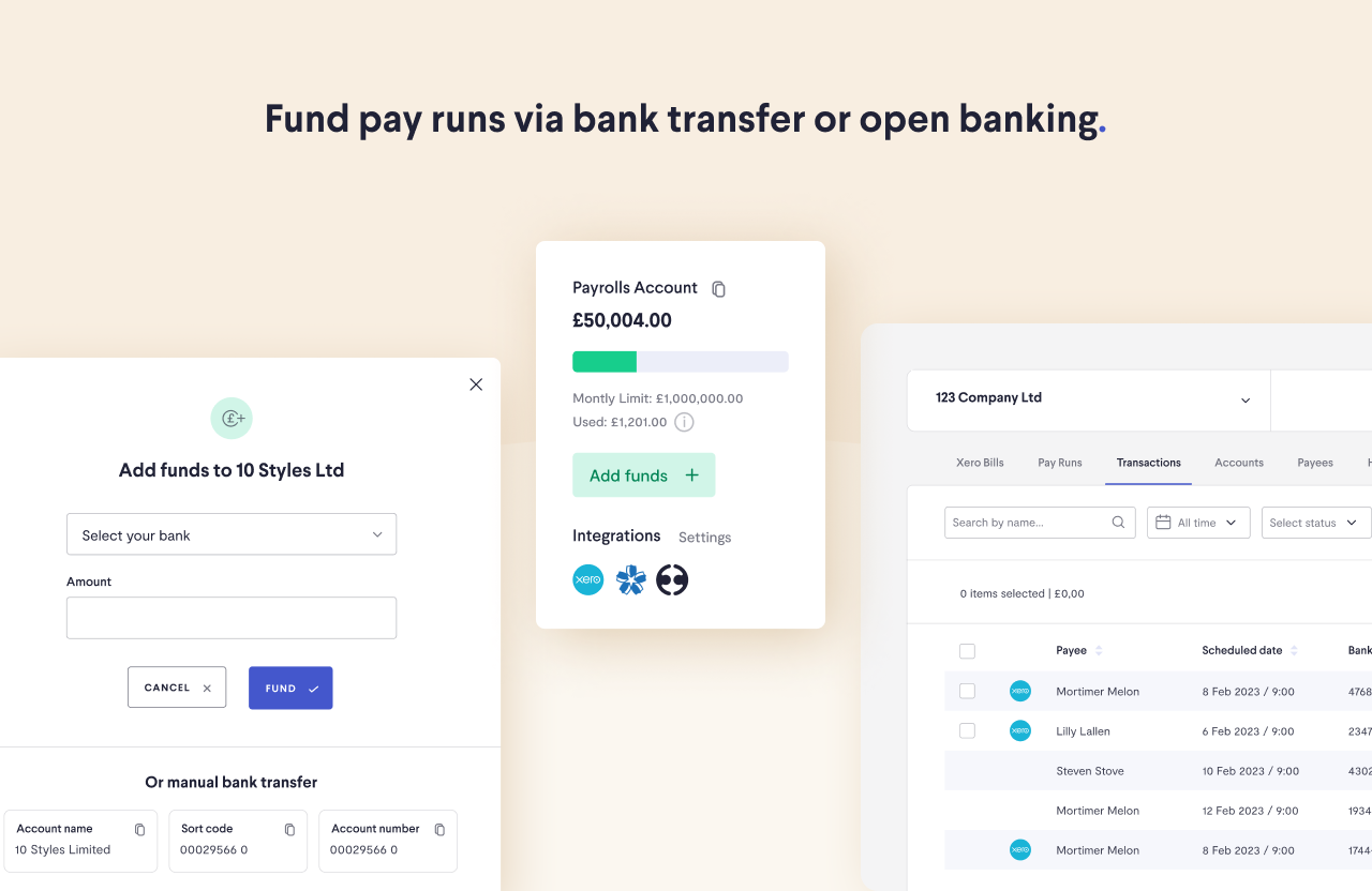 You can prepare pay runs easily, then fund a ringfenced e-money account when you need to process them. It's more secure than giving business bank access to 3rd parties and far less hassle than dealing with bank mandates, bulk payment services and file uploads. When a pay run is ready, simply fund the account and payments are sent instantly or on your scheduled date.