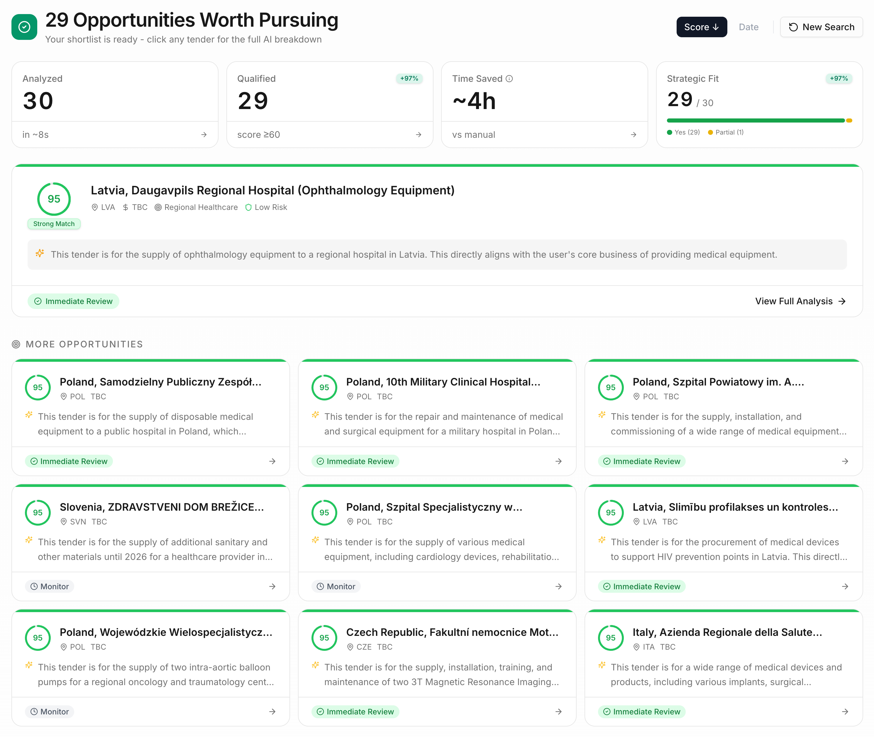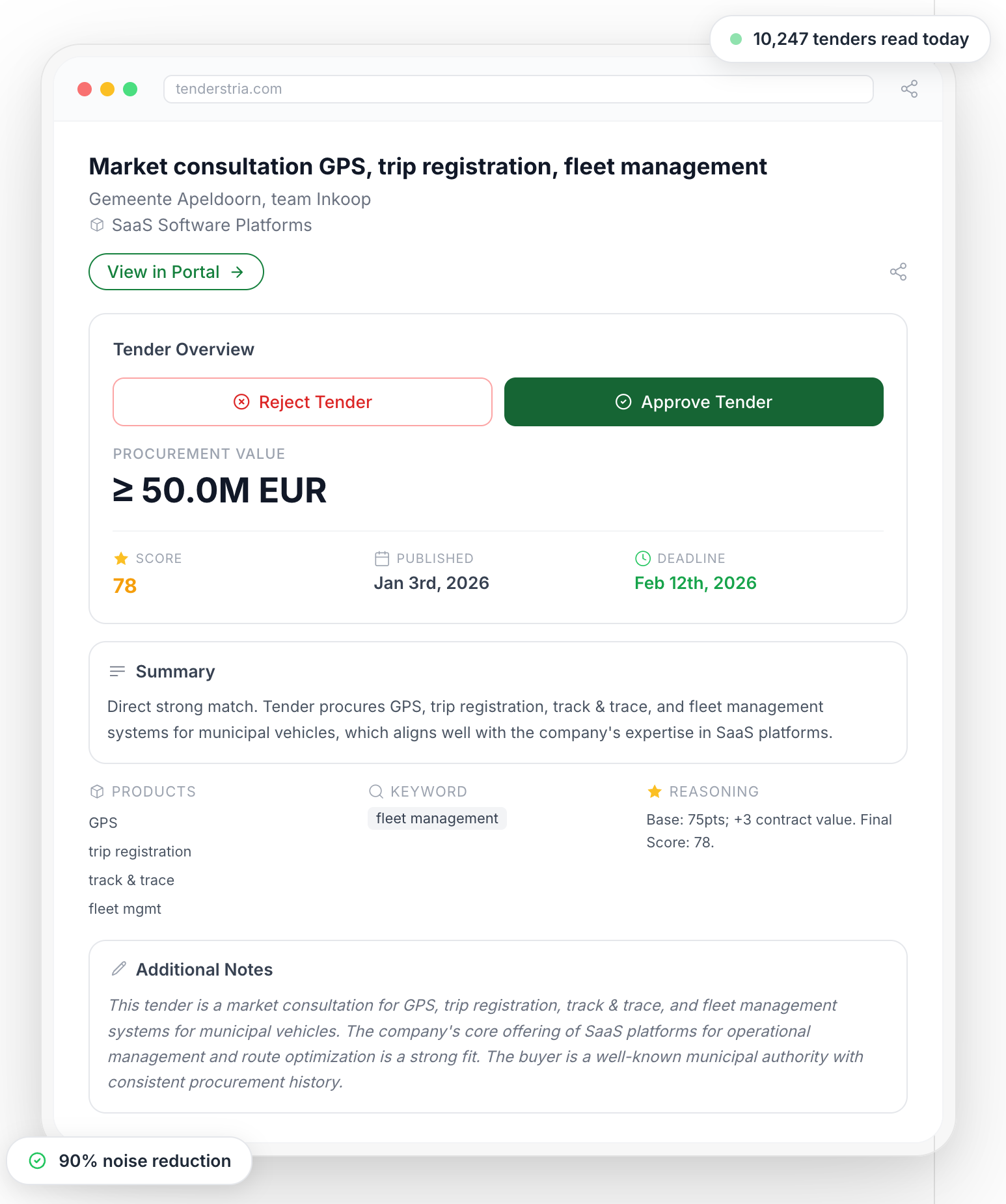 Each tender scored 0-100 with written reasoning showing why it matched. Approve or reject from a single view