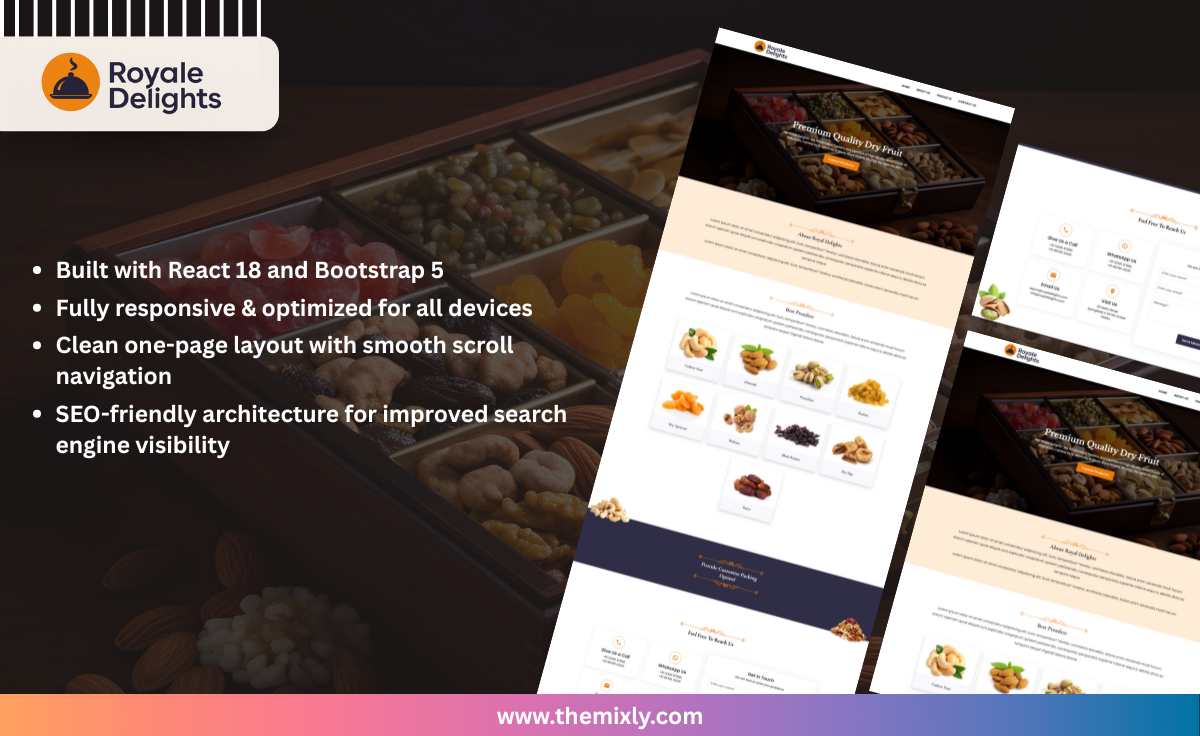 RoyaleDelights, a react one-page template for building fast, modern food brand websites. Clean code, responsive UI – perfect for developers & agencies.
