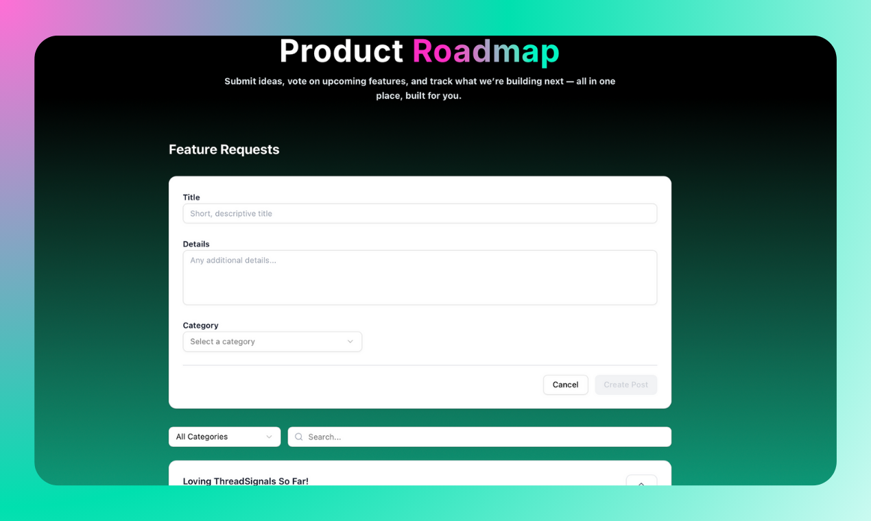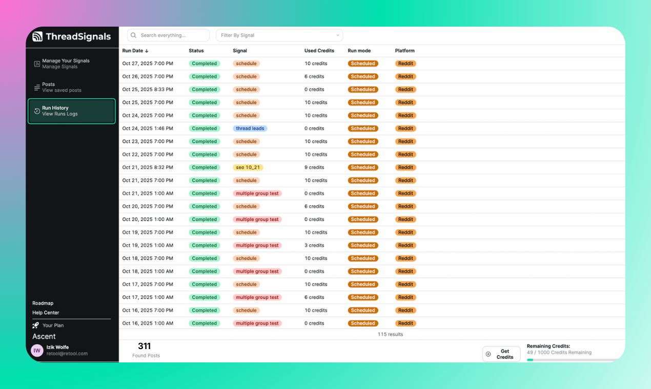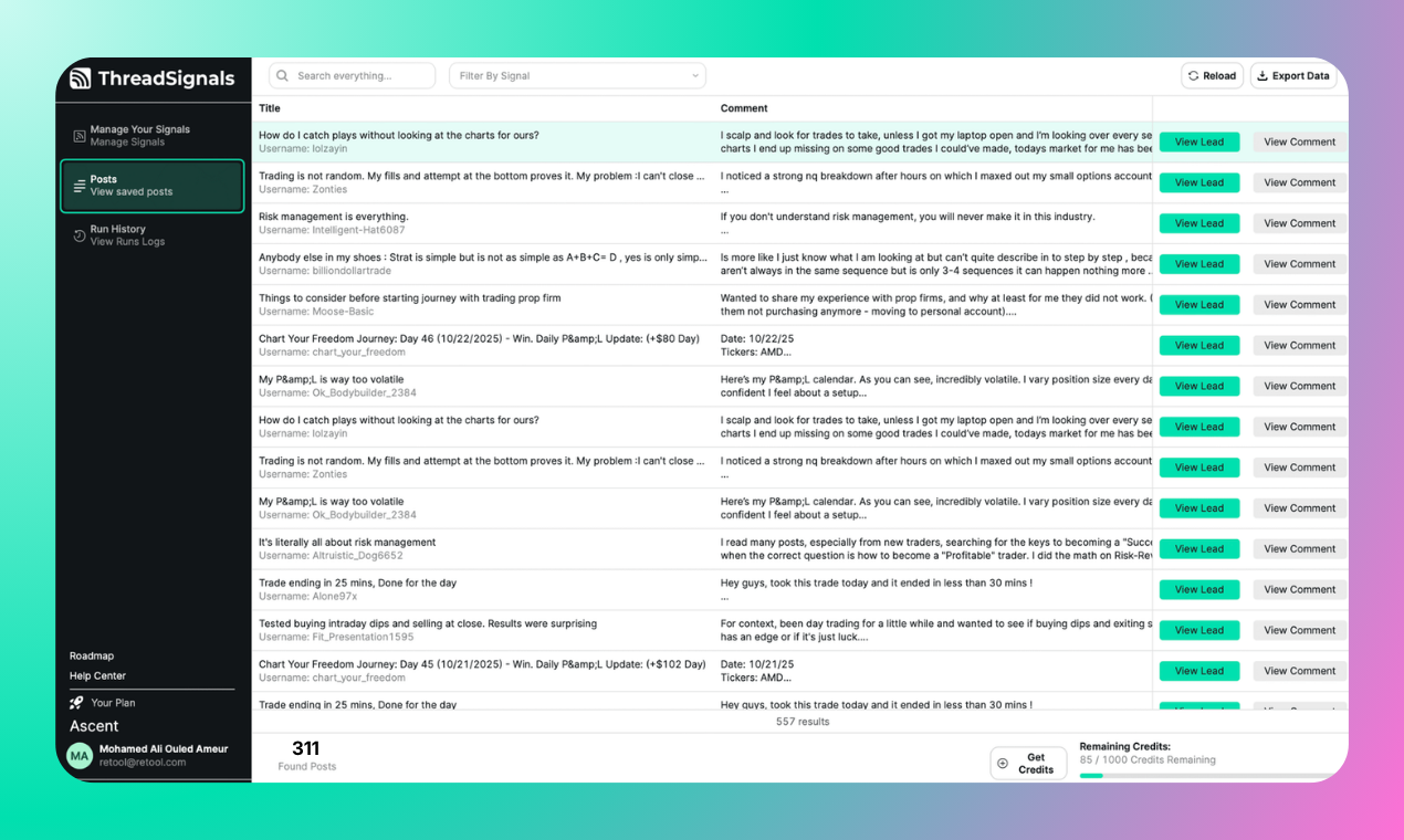 - Keyword-based signal tracking: Users define the topics, phrases, and communities they want to monitor. ThreadSignals runs searches automatically and delivers new matches as they appear, eliminating the need for manual research.