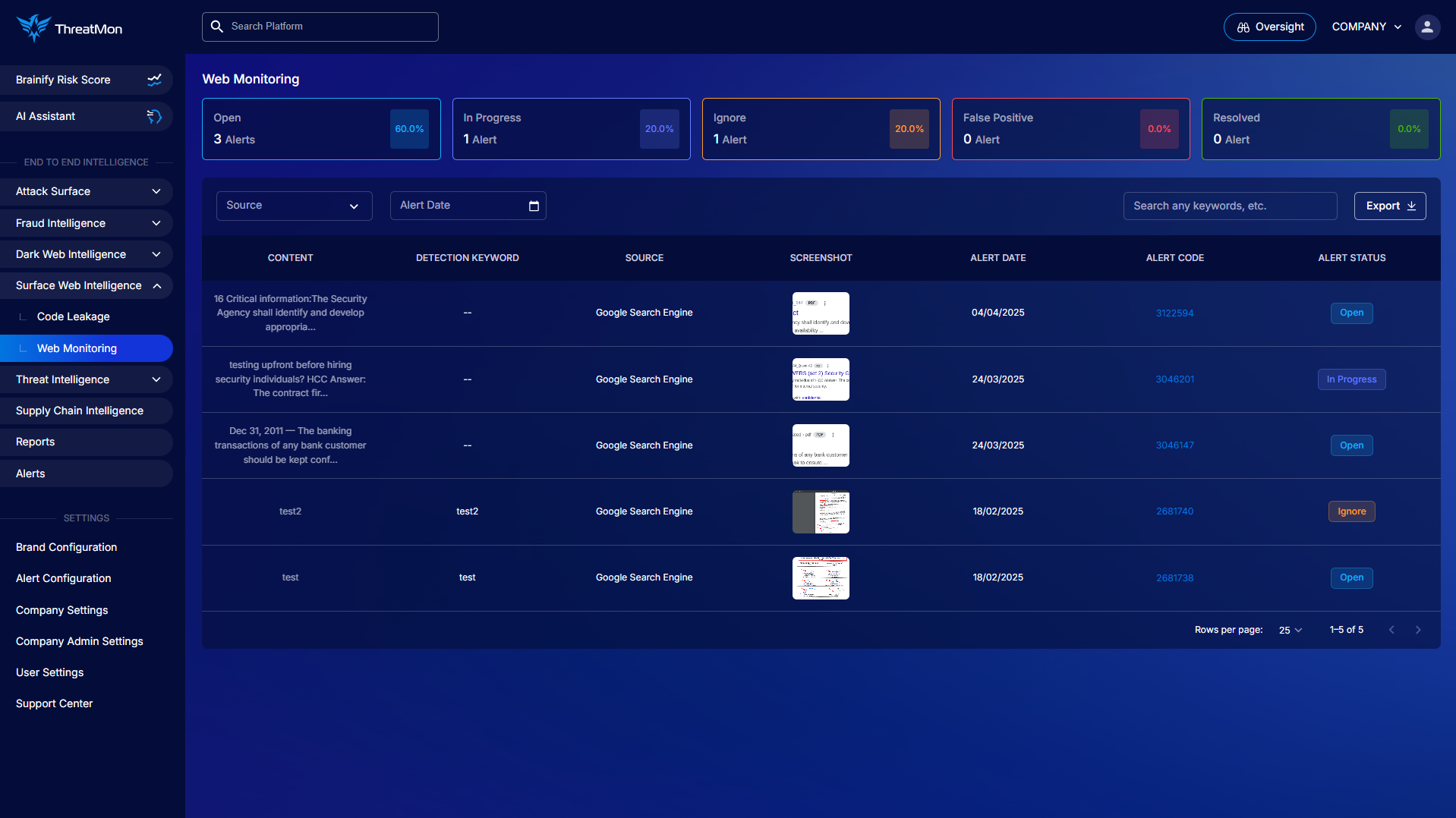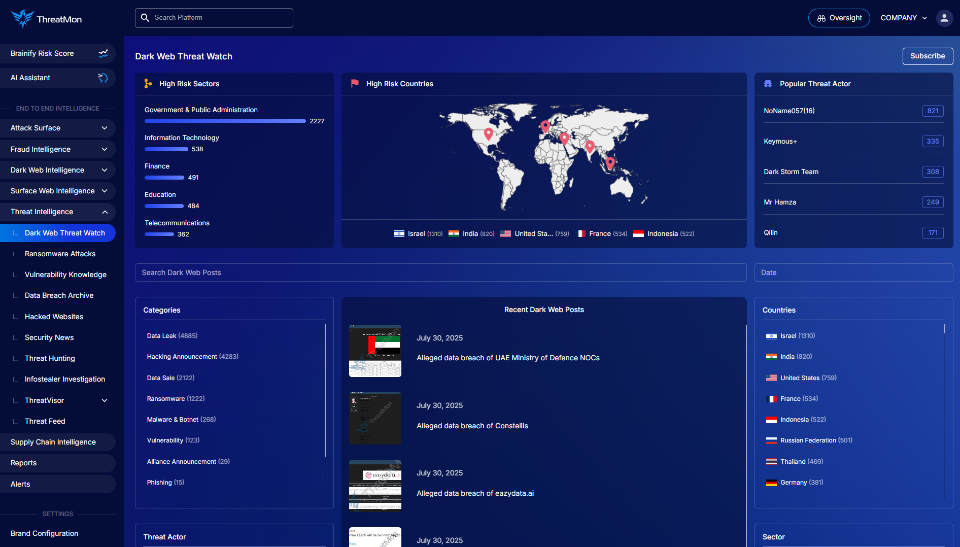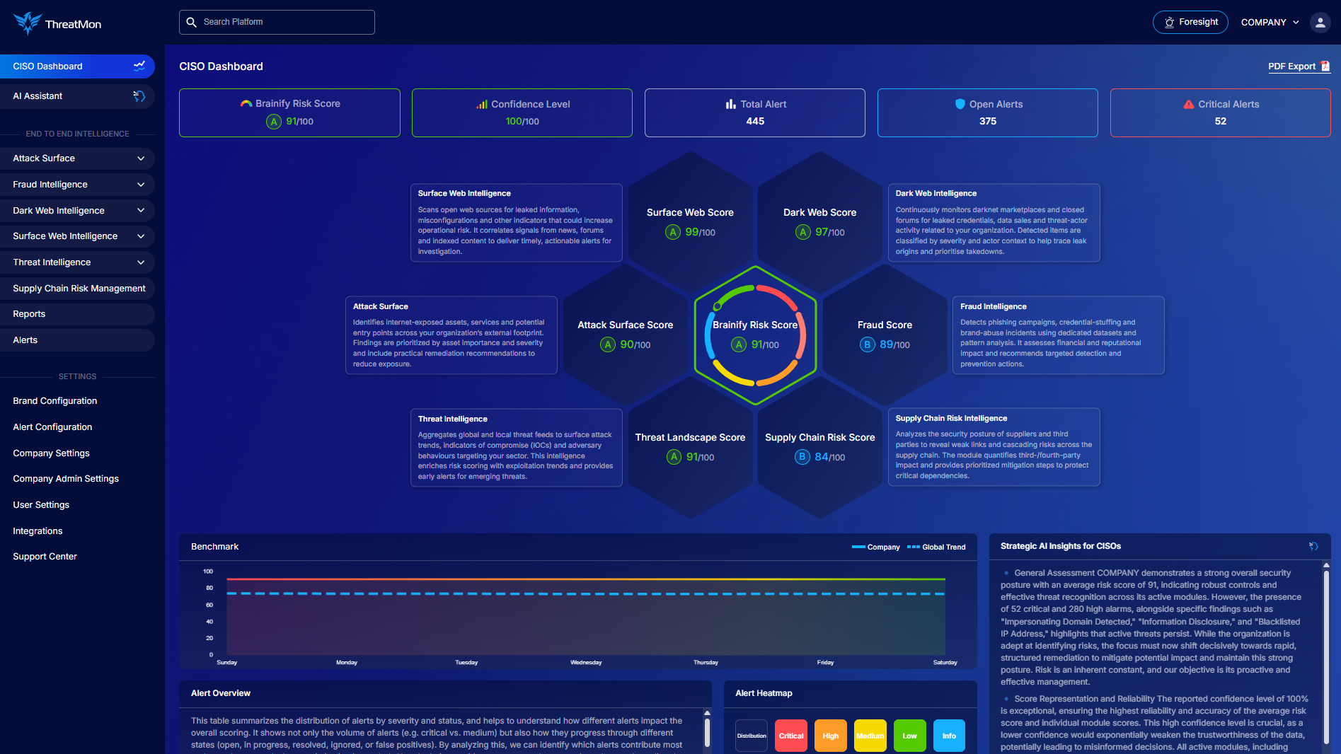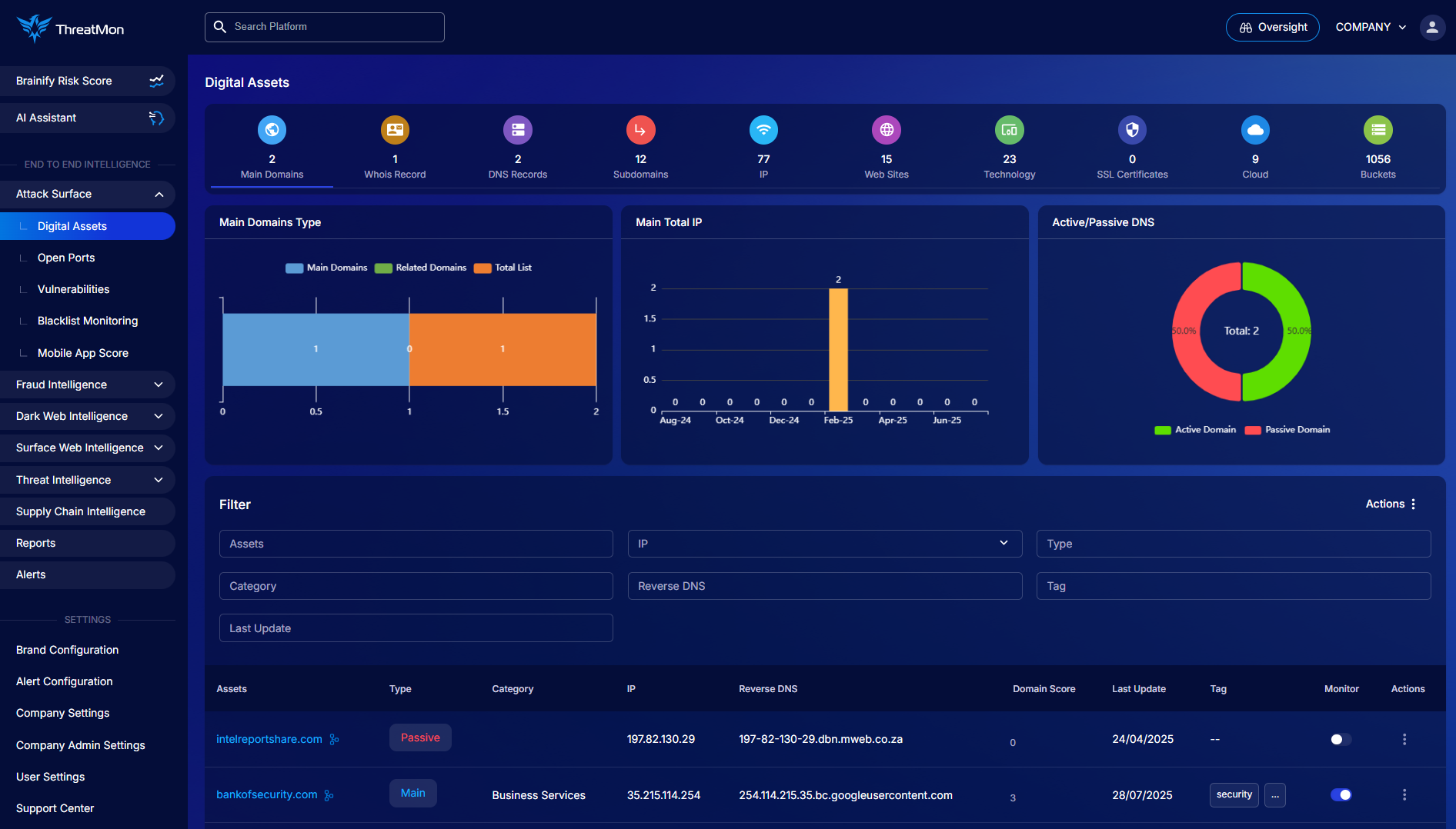 At the heart of ThreatMon is its AI Assistant, a security-focused virtual analyst that enhances the threat detection process. This feature supports various functions, including threat hunting, alarm management, vulnerability assessment, and dark web monitoring. The Attack Surface Intelligence module continuously discovers and monitors exposed digital assets such as domains, subdomains, IPs, cloud buckets, and SSL certificates. It performs real-time vulnerability detection, identifying misconfigurations and outdated technologies that adversaries may exploit. The findings are scored using the Brainify Risk Score, which integrates threat intelligence, advanced persistent threat (APT) actor patterns, CVE exploitability, and geo-sector risk factors, providing organizations with a clear understanding of their risk landscape.