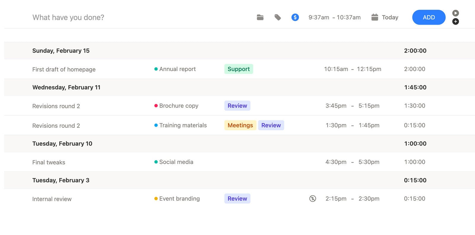Users can start a timer while they work or add time entries later. Each entry is linked to a project or client, which keeps work organized and makes it easier to review past activity. All time records are stored in one place, so users can look back and see what they worked on and when.
