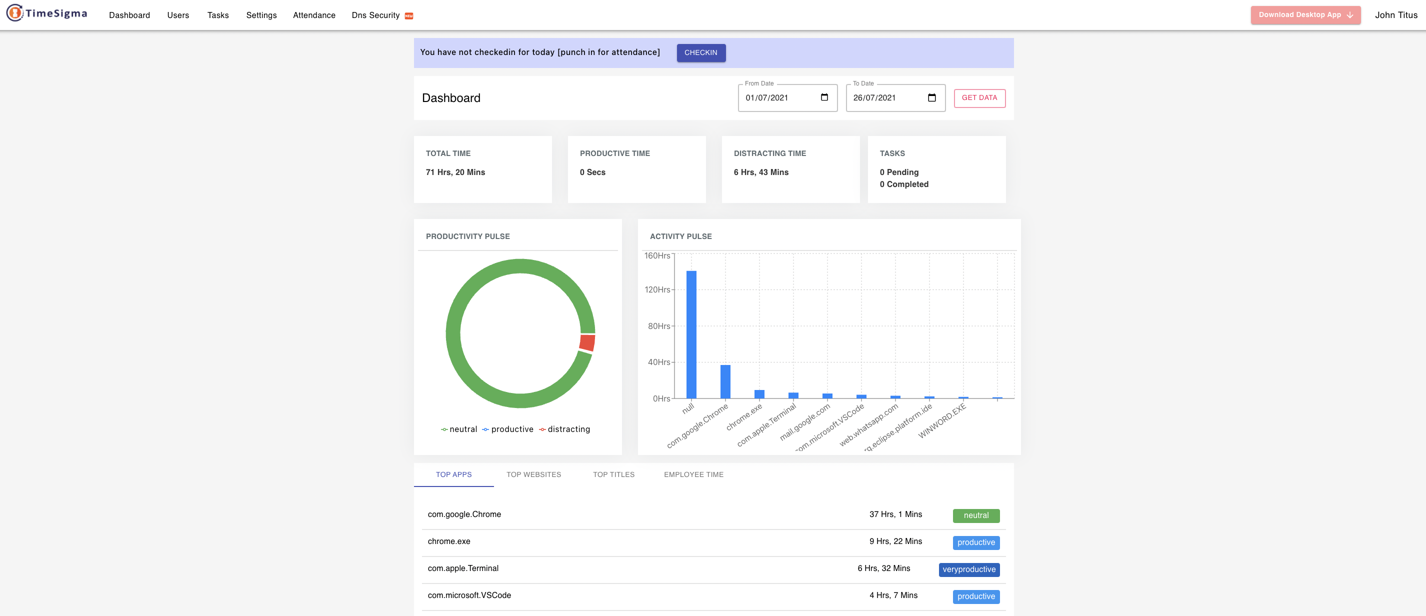 View overall Employee Activity Snapshot. Productivity Pulse and a list of Top apps and websites.