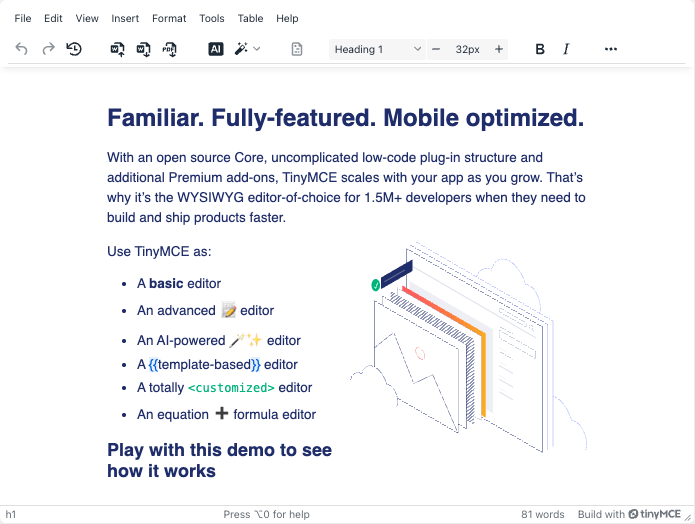 What I appreciate most about TinyMCE is its intuitive design, which caters to both developers and end users. The interface feels familiar, much like working in Word, yet it operates seamlessly within a browser. Additionally, the range of customization options and the robust plugin ecosystem make it straightforward to create the precise editor your application requires. Review collected by and hosted on G2.com.