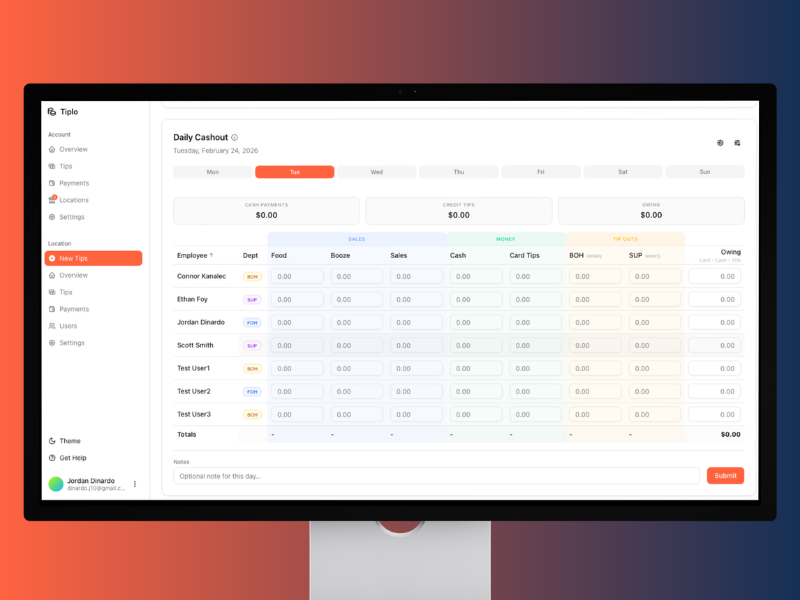 Use Cases: Restaurant owners use Tiplo to eliminate 10+ hours per week spent on ATM withdrawals, cash counting, and envelope stuffing. General managers use it to stop staying late after every shift doing tip calculations on spreadsheets. Accountants and bookkeepers use Tiplo's one-click exports to get clean, reconciled tip records for payroll integration and tax filing. Multi-location restaurant groups use the platform to standardize tip processes across all locations while maintaining local flexibility. HR managers use Tiplo to ensure compliant, timely tip payments that keep staff satisfied and reduce turnover.